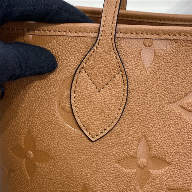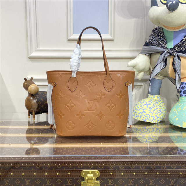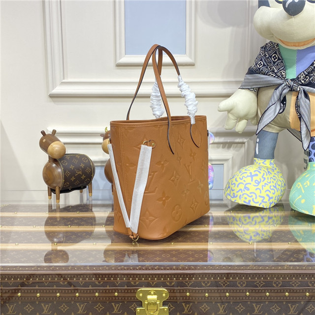 With this Neverfull MM carryall in Cognac Brown cowhide leather, Louis Vuitton brings a new, natural aspect to a flawless classic. Embossed into the supple leather, the Monogram Flowers and LV Initials give the bag an understated charm. The leather handles slip comfortably over the shoulder or arm. Inside is a removable matching zipped pouch.