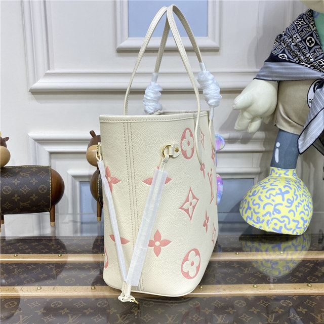 Elegant in bicolor Monogram Empreinte leather, this Neverfull MM tote will lend a springlike touch to the season’s silhouettes. Roomy yet sleek, the carryall can be styled in two ways: with the side laces cinched for a streamlined effect, or loosened for a more casual look. Two long leather straps ensure a comfortable, convenient carry.