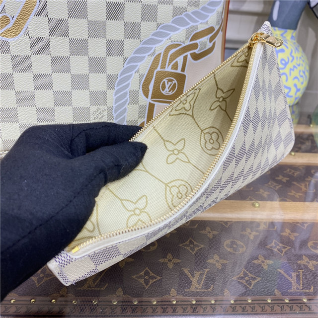 This Neverfull MM tote bag is made from Damier Azur coated canvas customized with a bold five-color nautical print of ropes and chains, bringing a fresh twist to the classic checkerboard pattern. This versatile bag features side laces that can be cinched for a sleeker silhouette or loosened for a more casual look.