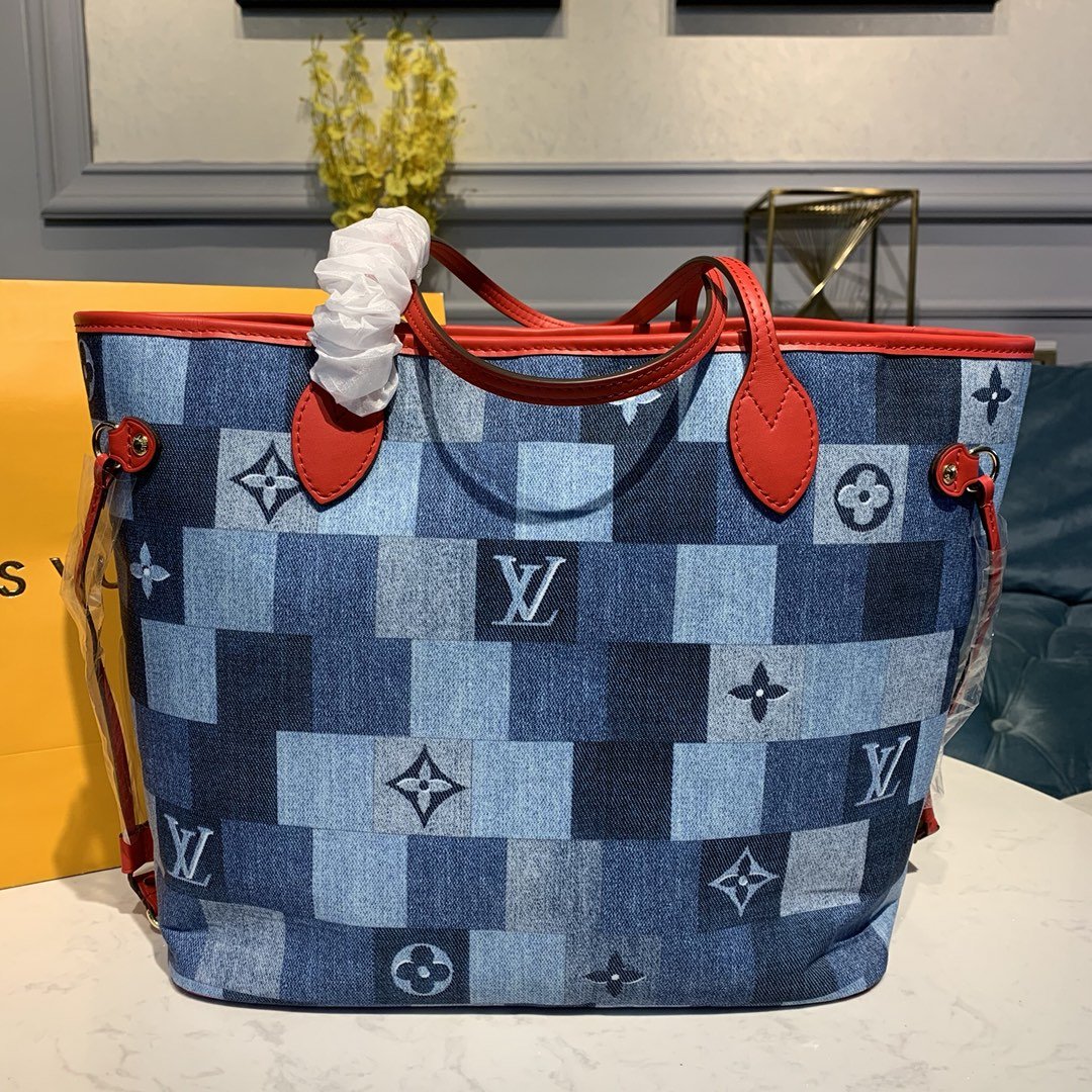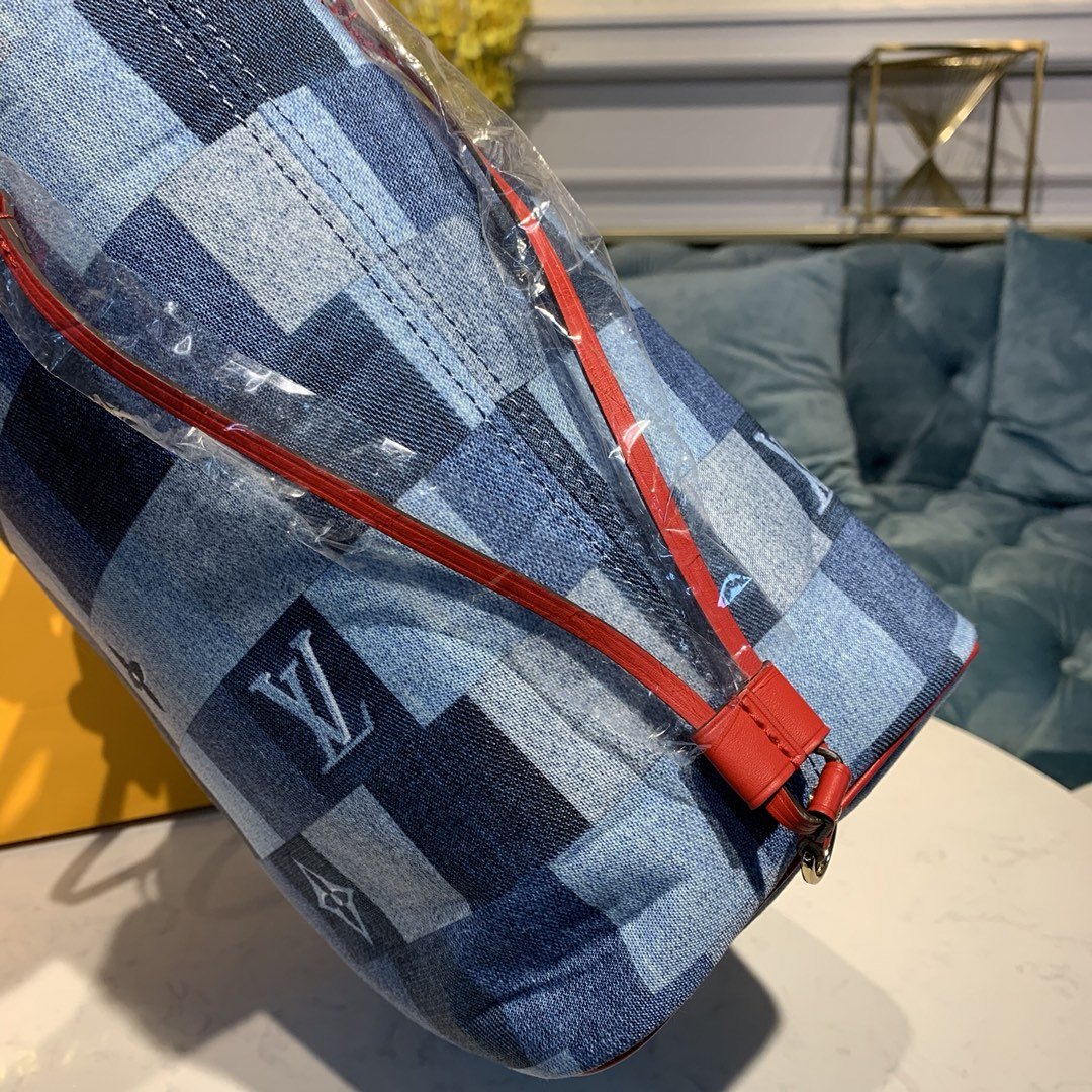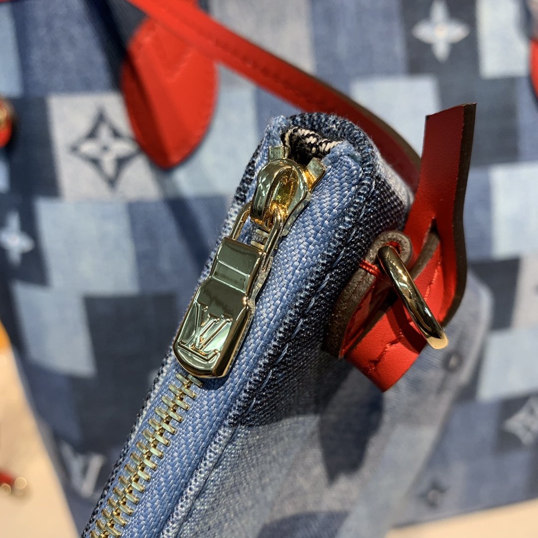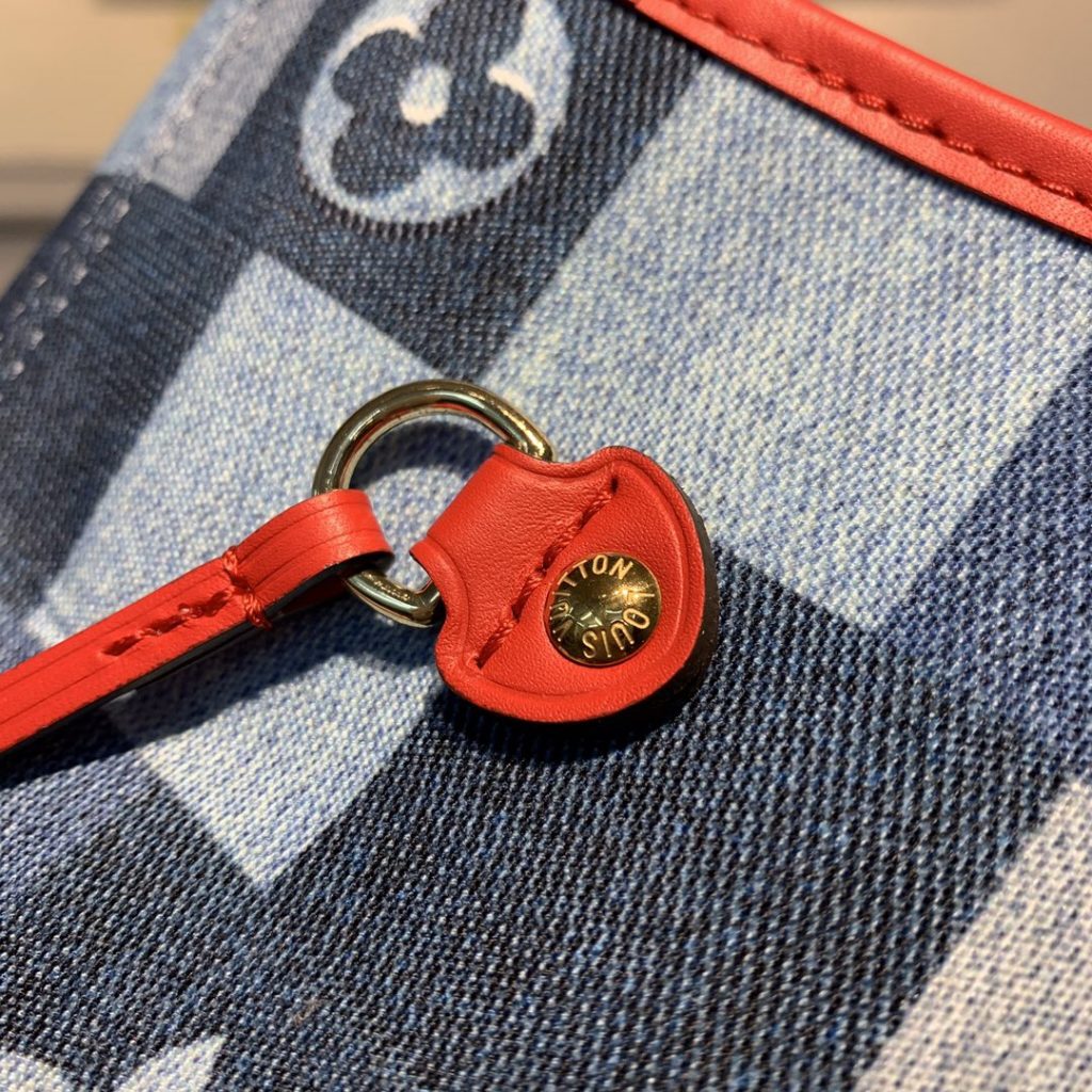 This edition of the legendary Neverfull tote looks fresh and fashionable, dressed in a patchwork of denim-blue hues. The pattern combines Damier with Monogram motifs, expertly printed on the canvas to give the illusion of texture and volume. Handles and side laces made of brilliant red leather enhance the crafted look of this versatile signature bag.