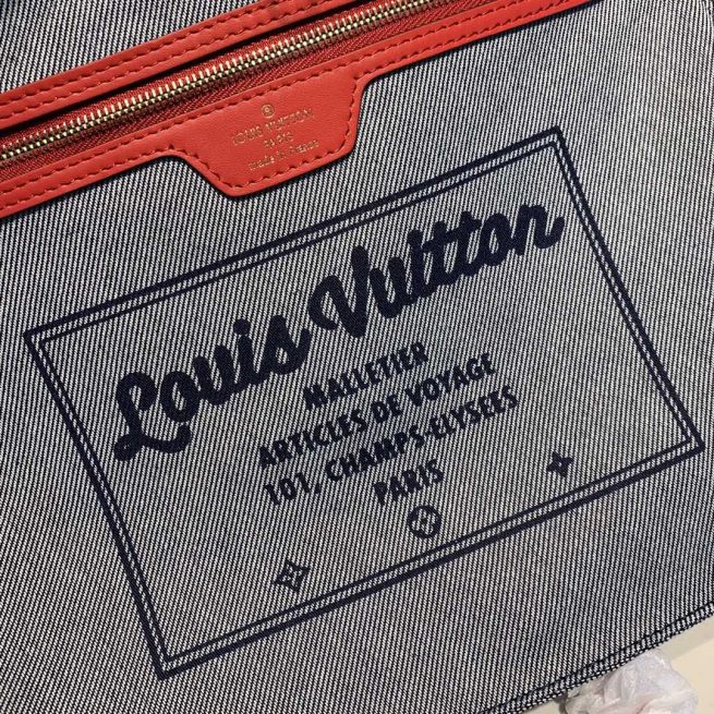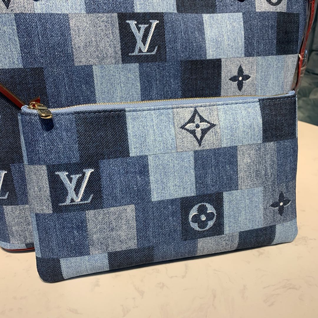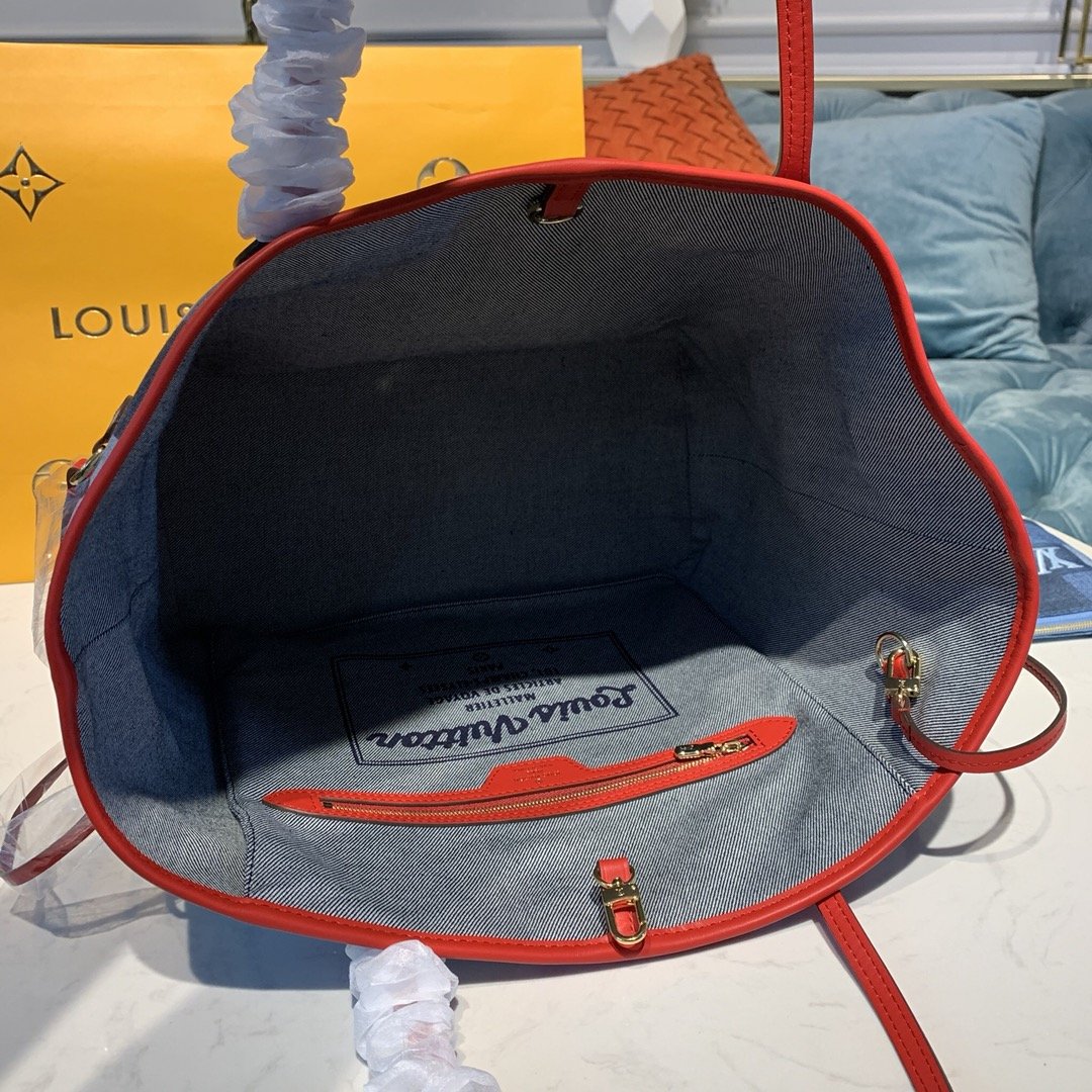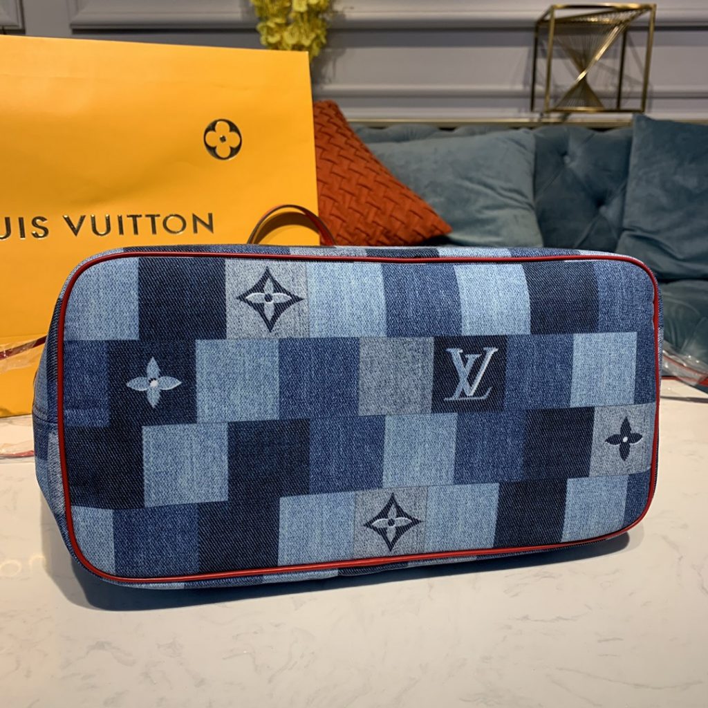 This edition of the legendary Neverfull tote looks fresh and fashionable, dressed in a patchwork of denim-blue hues. The pattern combines Damier with Monogram motifs, expertly printed on the canvas to give the illusion of texture and volume. Handles and side laces made of brilliant red leather enhance the crafted look of this versatile signature bag.