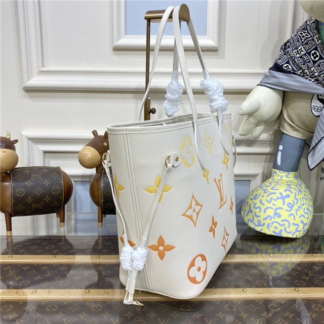 The Neverfull MM tote takes on a tastefully feminine feel in Monogram Empreinte leather, with a gradient treatment of oversized LVs and Monogram Flowers. This functional carryall can be cinched closed with its side laces or left open for a more casual look. Inside, there’s a removable zipped pouch in latching Monogram Empreinte leather will fit valuables.