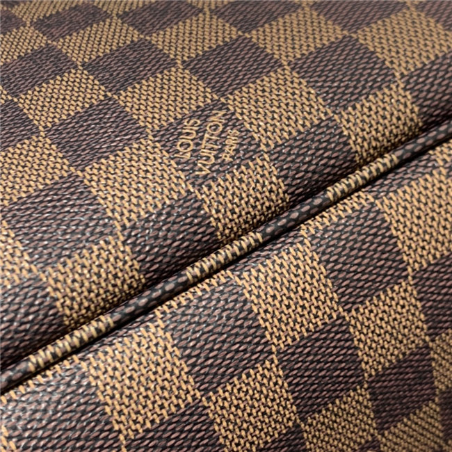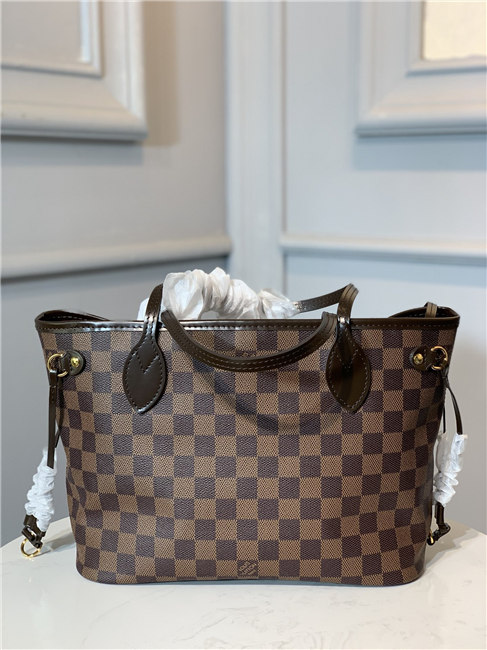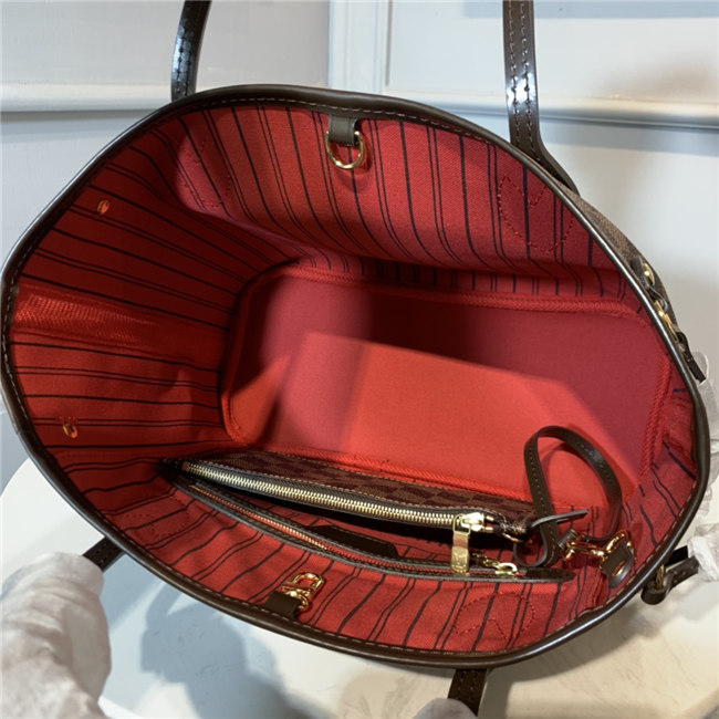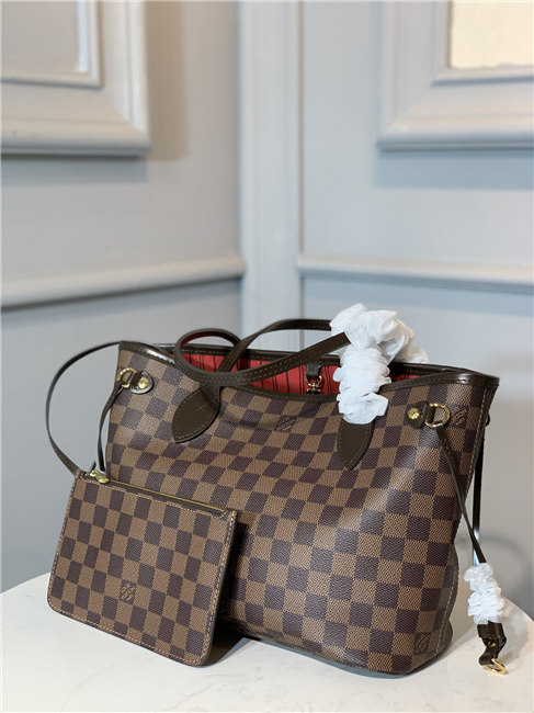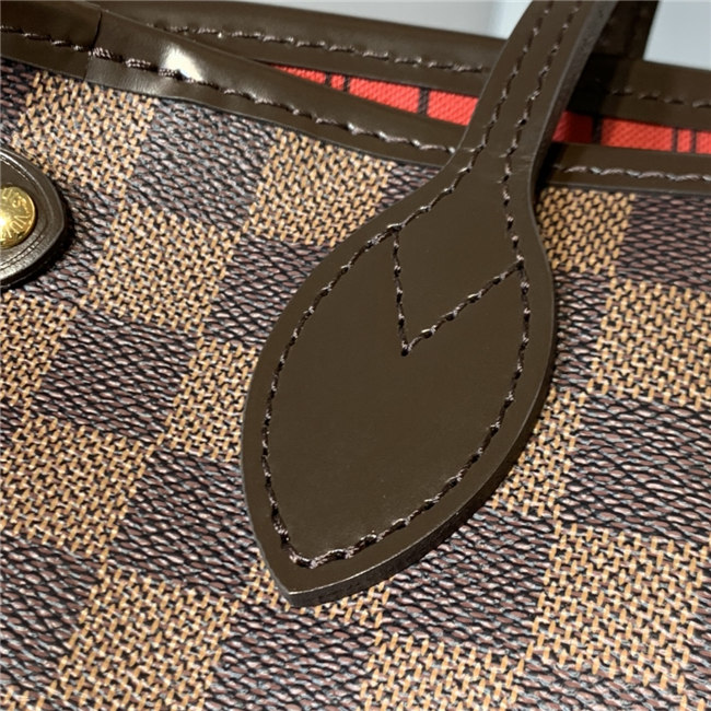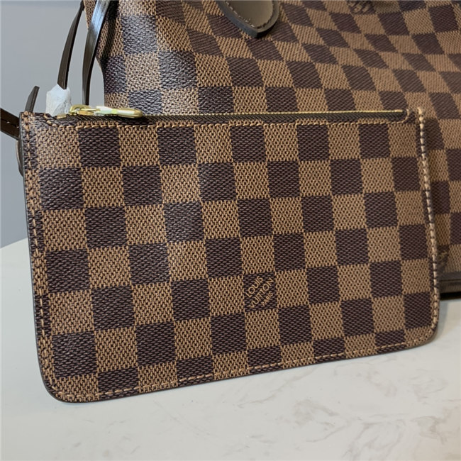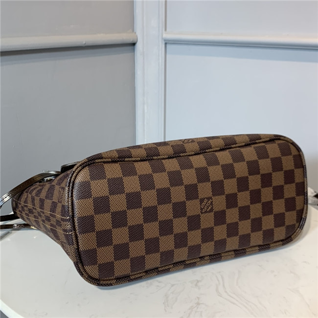 The Neverfull PM tote pairs timeless design with heritage details. Crafted from Damier Ebene canvas with natural cowhide trim, it is capacious yet not bulky, with side laces that cinch for a sleek allure or loosen for a casual look. Slim, comfortable handles slip easily over the shoulder or arm. Lined in colorful textile, it features a removable pouch which can be used as a clutch or an extra pocket.