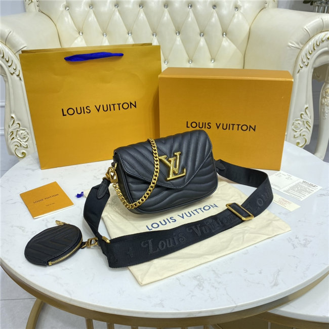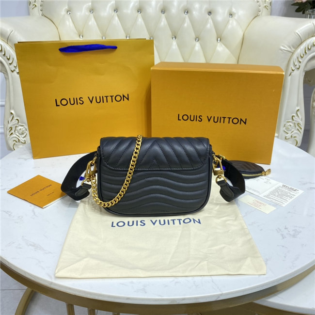 Louis Vuitton introduces the versatile New Wave Multi-Pochette crossbody handbag in quilted cowhide leather. With its wide strap, featuring an embroidered “Louis Vuitton” signature, gold-color chain for hand or short shoulder carry, and round coin purse clipped on the strap’s snap hook, all removable, it is the very definition of a versatile fashion accessory.