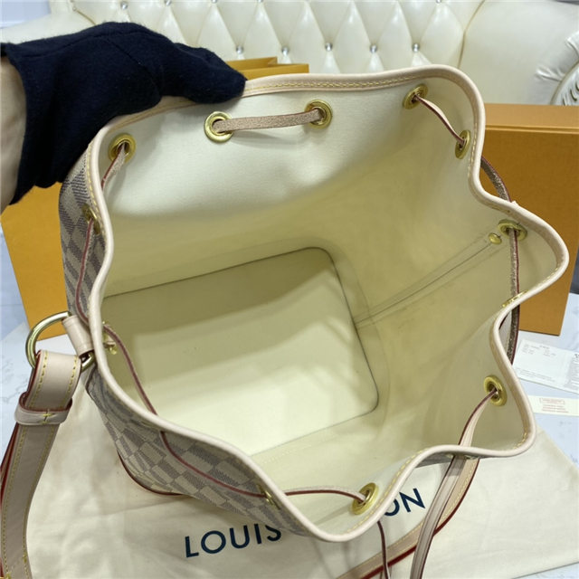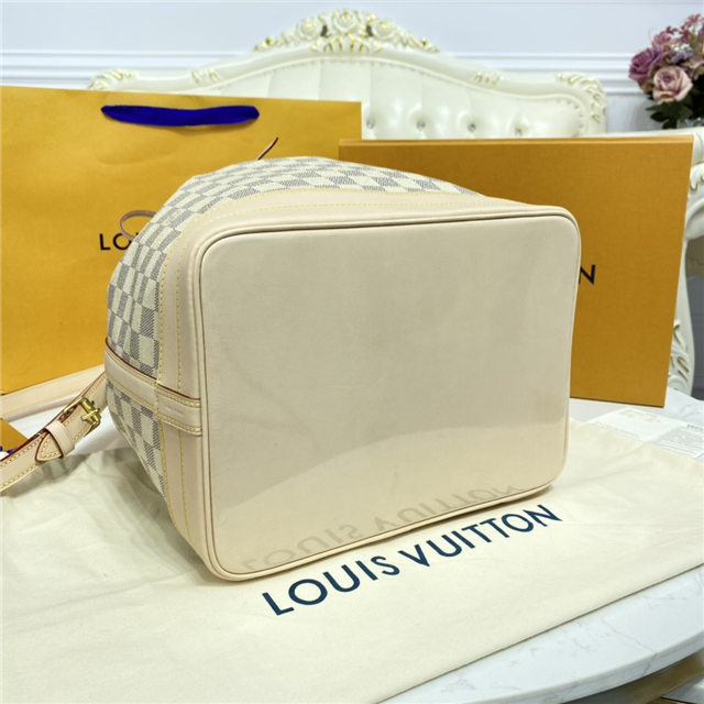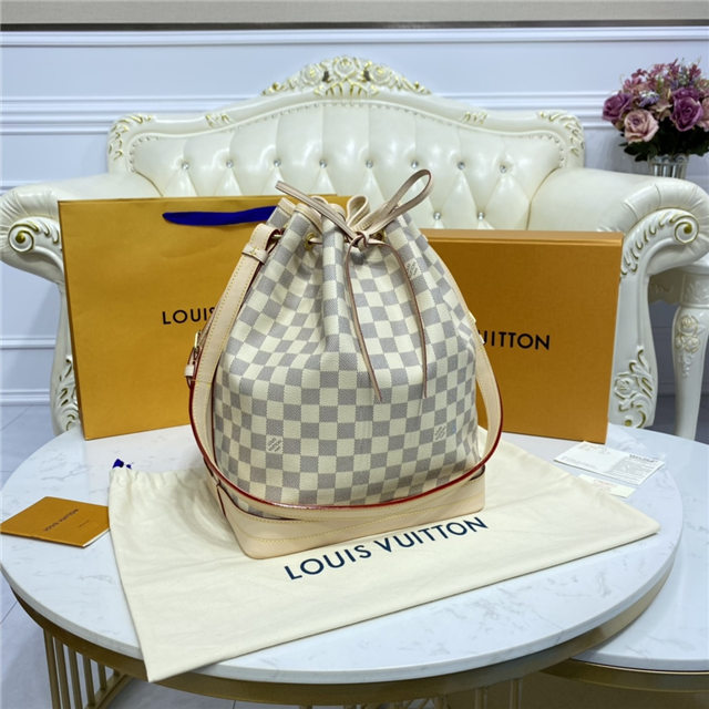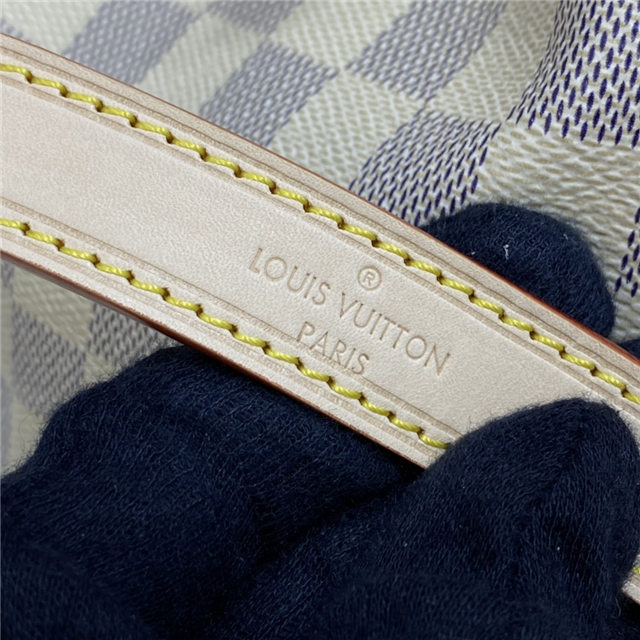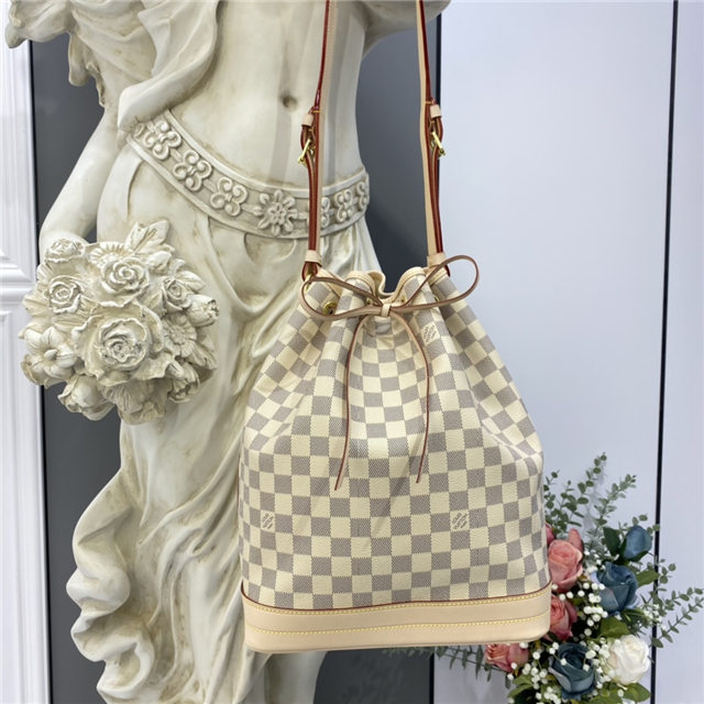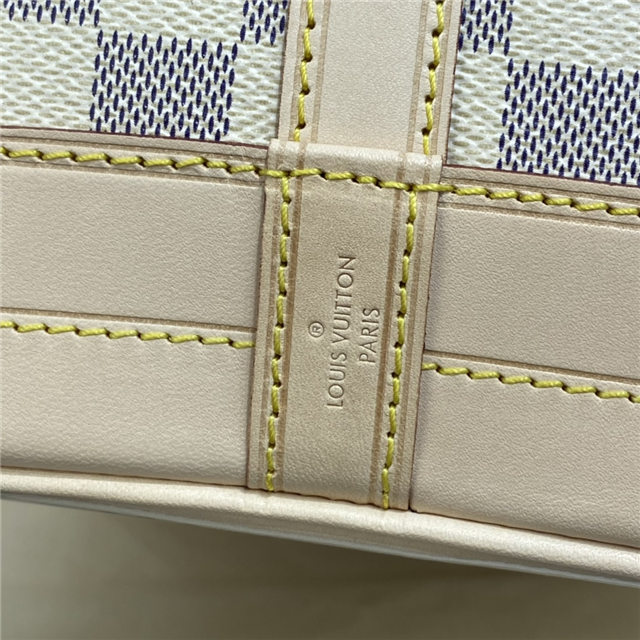 The Noé bucket bag harks back to a design from 1932. A Champagne producer asked Gaston-Louis Vuitton to develop a sturdy, stylish bag in which he could transport five bottles of bubbly. This model in body-friendly Damier Azur canvas retains key features of the original – the iconic shape, generous volume, drawstring closure – but is made for modern life. The leather strap adjusts for comfortable shoulder wear.