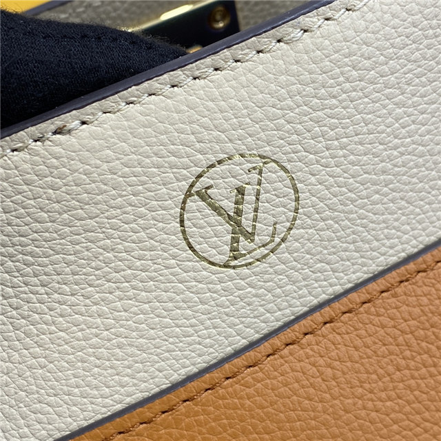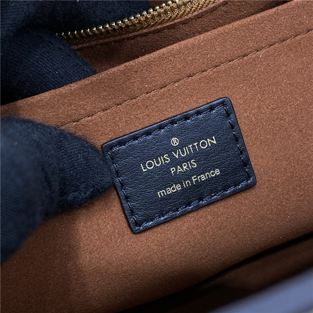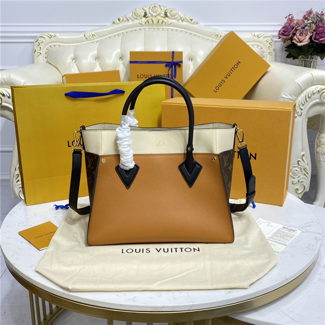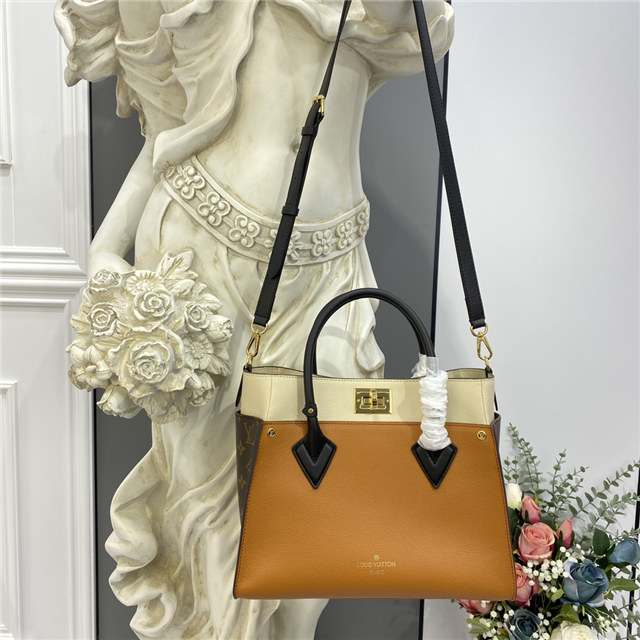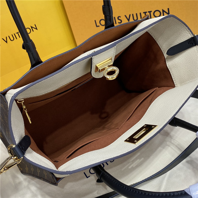 The On My Side MM tote bag is fashioned from an elegant combination of small-grained calf leather and emblematic Monogram canvas. The large outside pockets in contrasting canvas create a bag-in-a-bag look. The roomy interior can easily hold everything needed for a day at the office while the adjustable strap makes for practical cross-body carry.