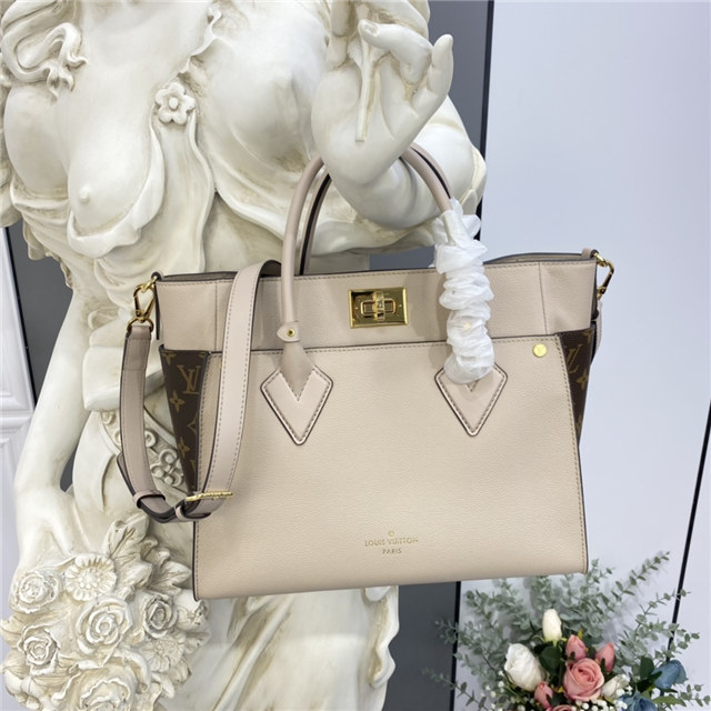 The On My Side MM tote bag is fashioned from an elegant combination of small-grained calf leather and emblematic Monogram canvas. The large outside pockets in contrasting canvas create a bag-in-a-bag look. The roomy interior can easily hold everything needed for a day at the office while the adjustable strap makes for practical cross-body carry.