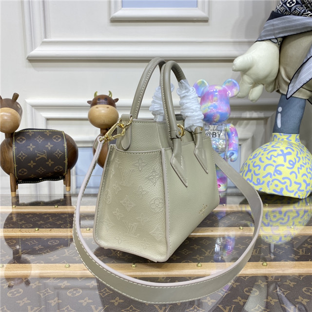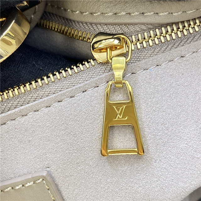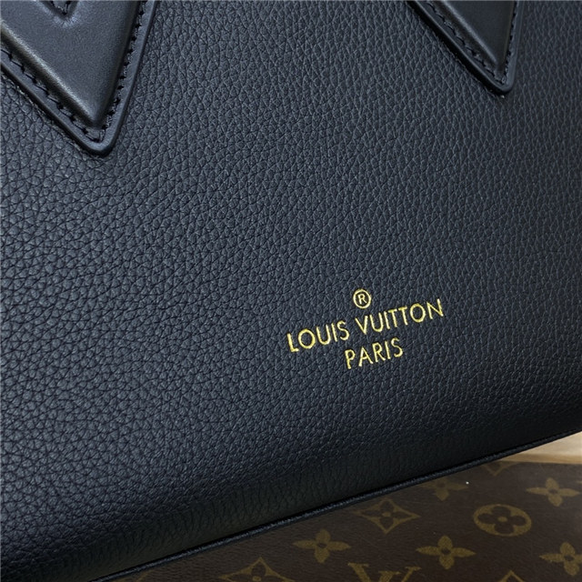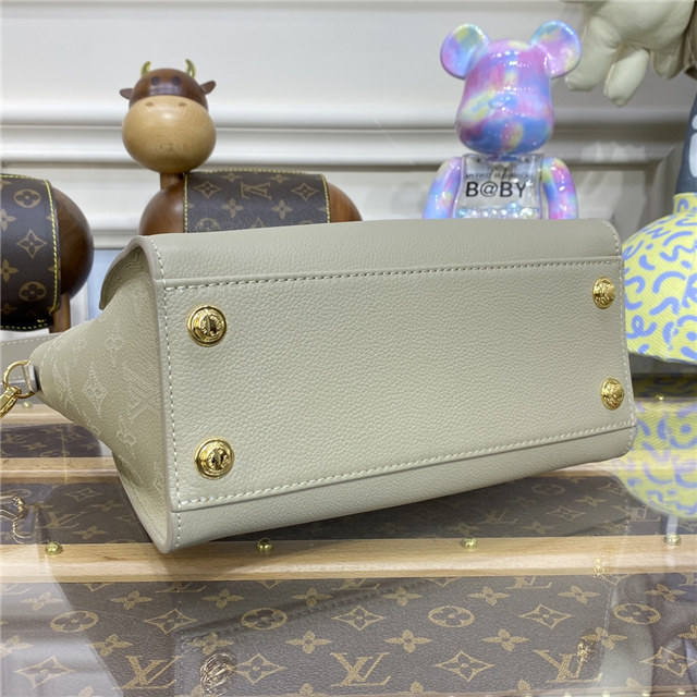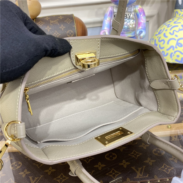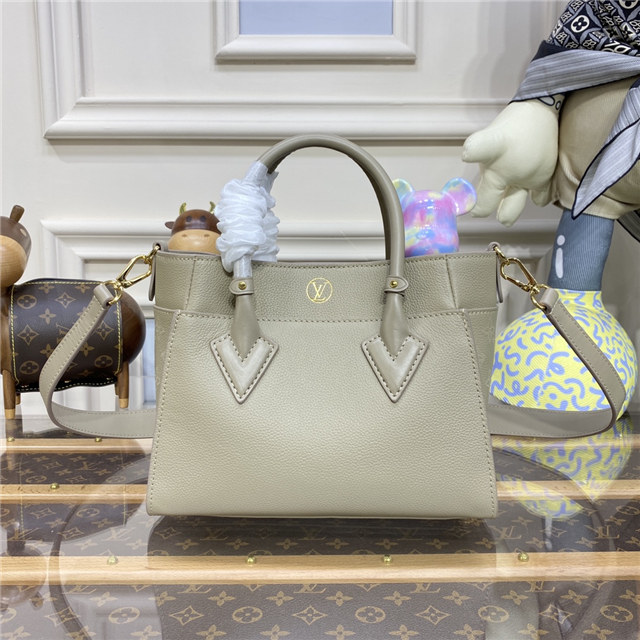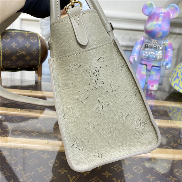 The On My Side PM tote bag is made from calf leather in a soft gray colorway, with sides in Mahina calf leather and its perforated Monogram pattern. Functional, this tote has two outside pockets for quick access to essentials. Two top handles and a removable strap enable shoulder or cross-body carry.