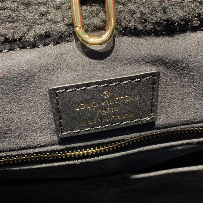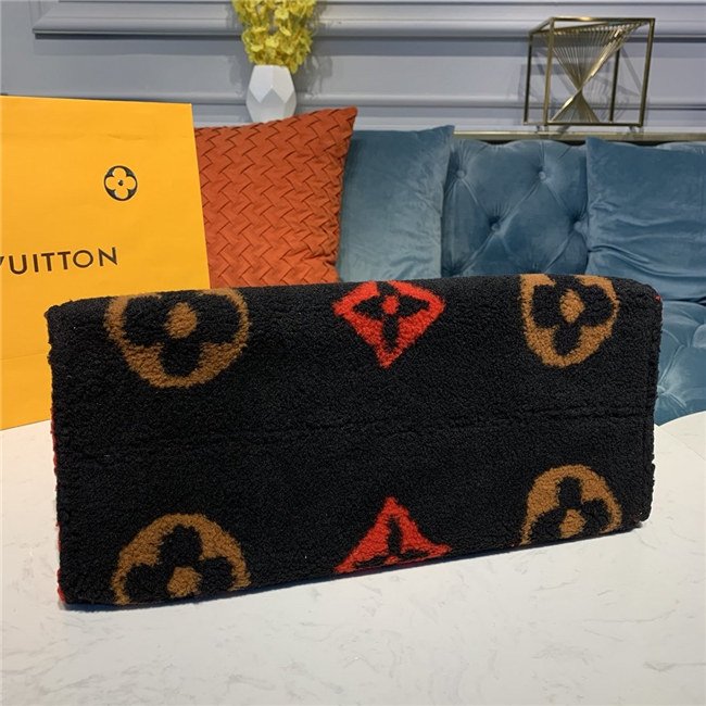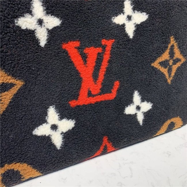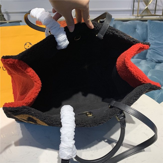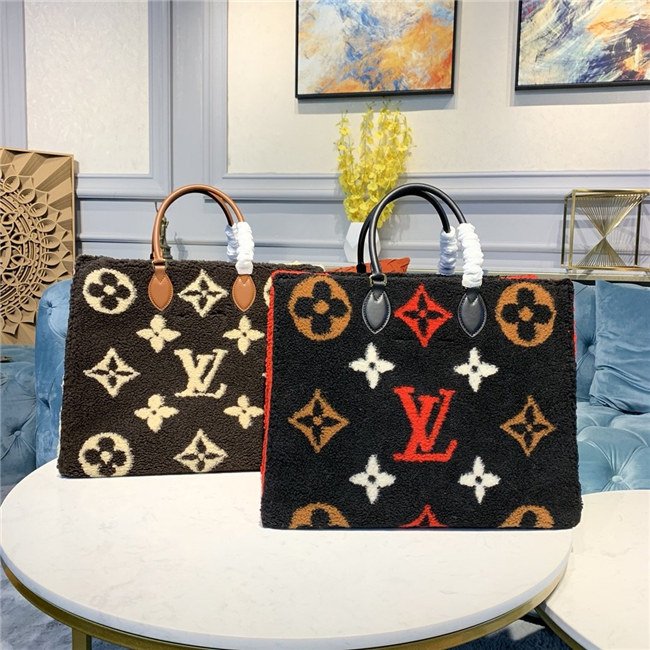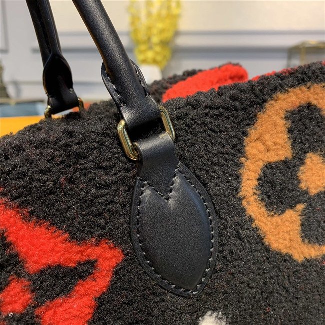 The Onthego GM tote bag is revisited in super-soft shearling as part of the Monogram LV Teddy special edition. An intricate intarsia technique is used to recreate the iconic Monogram pattern. The result is a fluffy look and a cozy feel for this spacious, modern bag, which can be carried in several different ways.