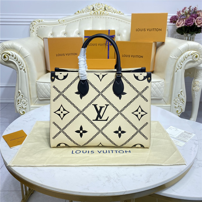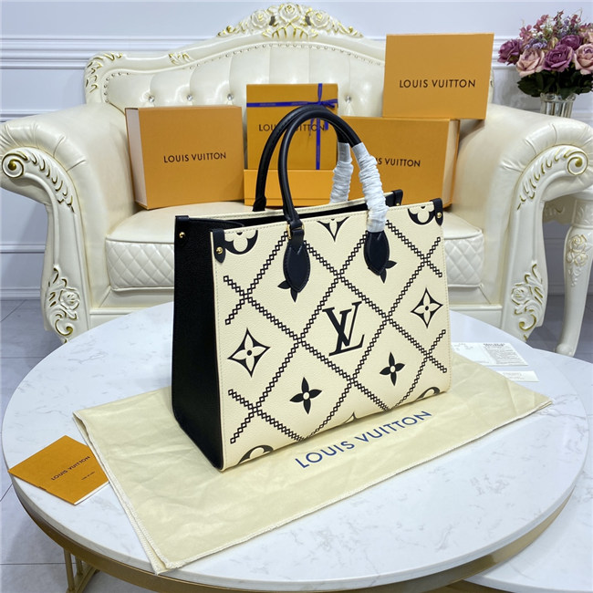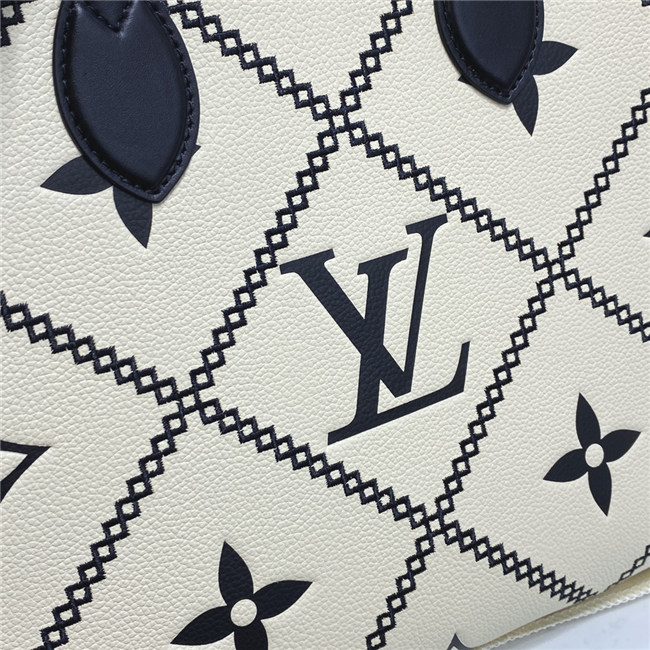 This Onthego MM tote features a stitched motif that echoes the quilted interior of Louis Vuitton’s original trunks. The Monogram Empreinte leather is first printed, then embossed and embroidered with the pattern, to create a rich, crafted effect. A statement piece of the season, the bag is a versatile companion that lends itself to a variety of carry styles.