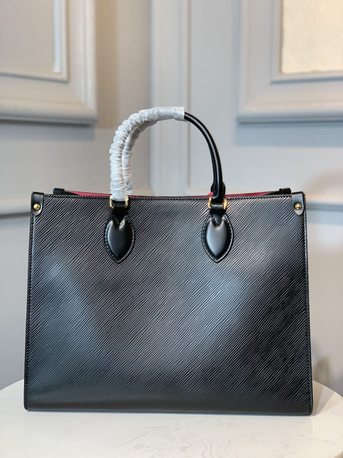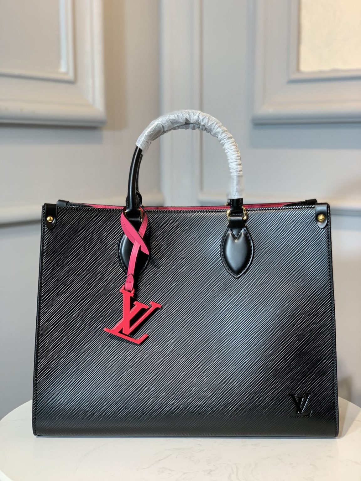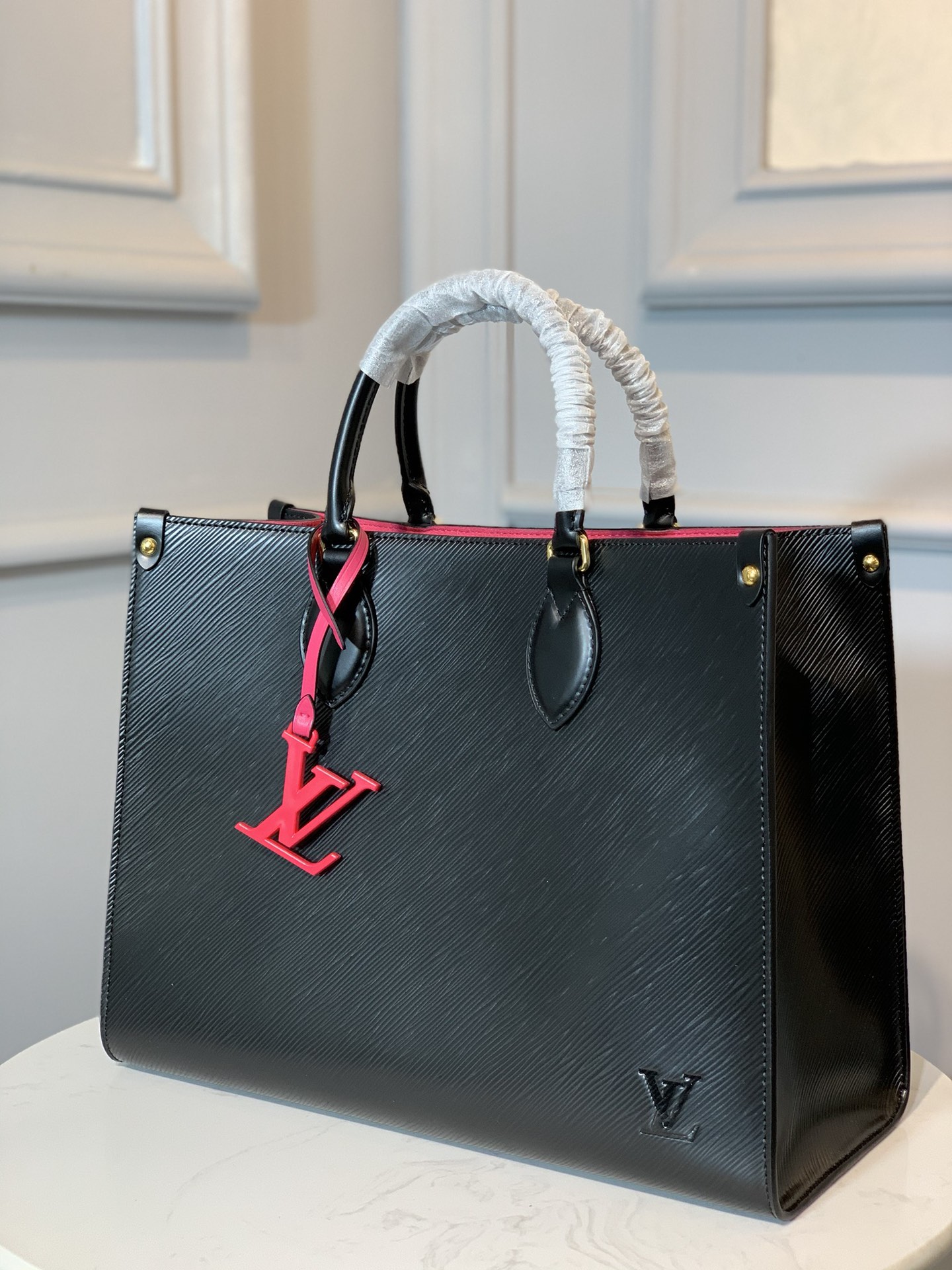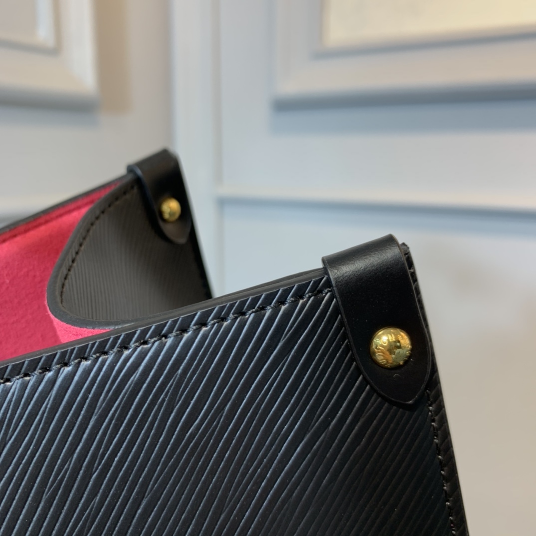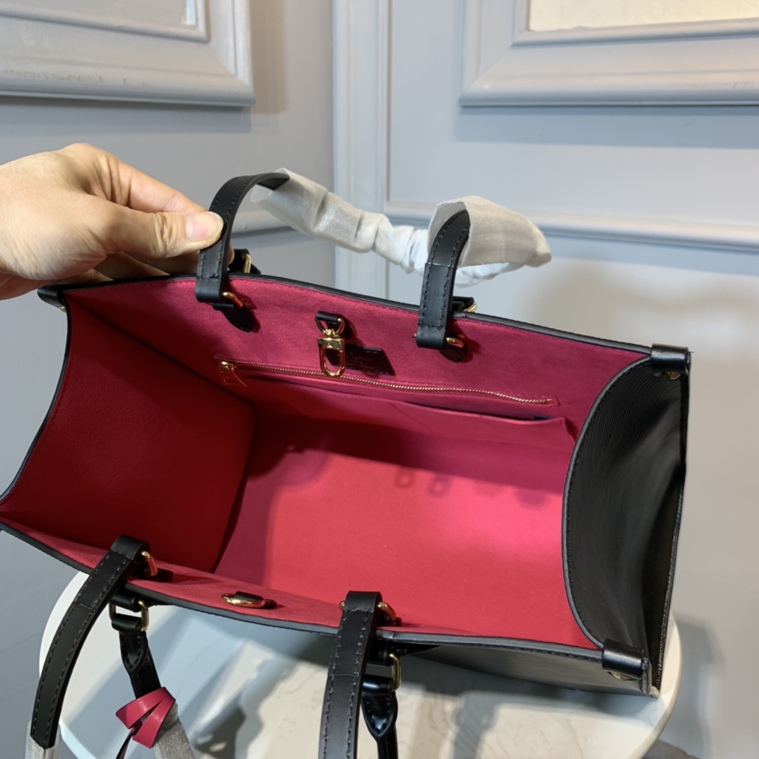 The Onthego GM tote bag is made from Epi grained leather with an inside lining in a contrasting color and accessorized with an eye-catching LV charm. Two sets of handles, long and short, allow hand and shoulder carry, and a roomy interior, which easily fits work essentials, including a laptop, make it a versatile everyday bag.