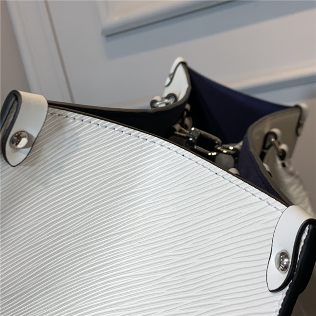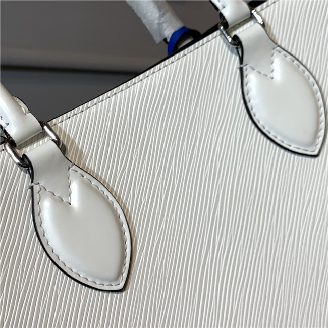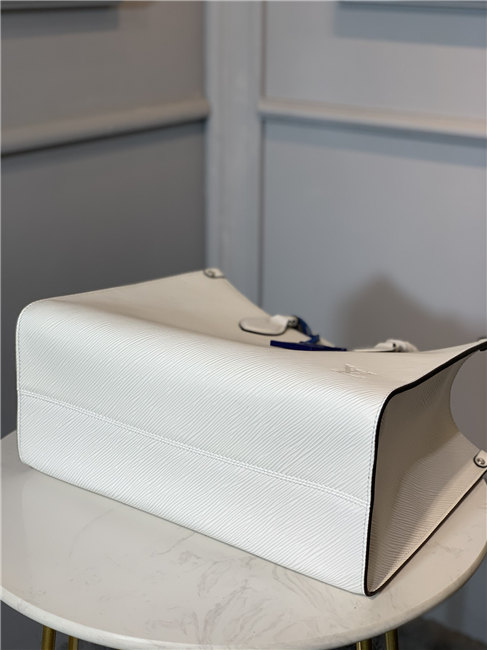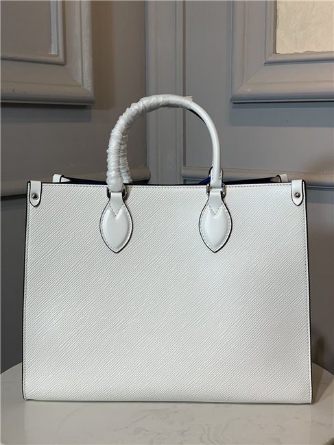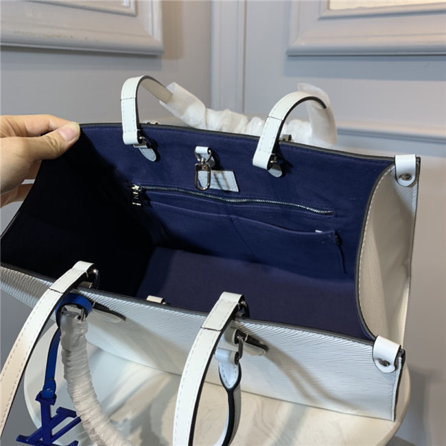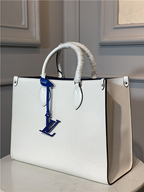 The Onthego MM tote bag is made from Epi grained leather with an inside lining in a contrasting color and accessorized with an eye-catching LV charm. Two sets of handles, long and short, allow hand and shoulder carry, and a roomy interior, which easily fits work essentials, including a laptop, make it a versatile everyday bag.