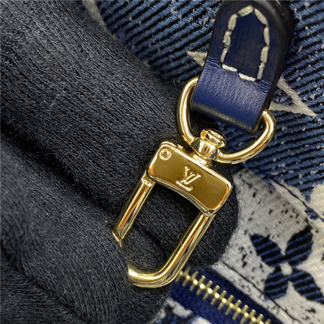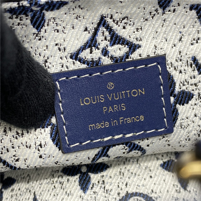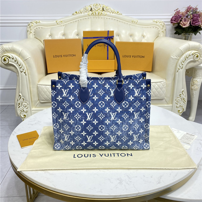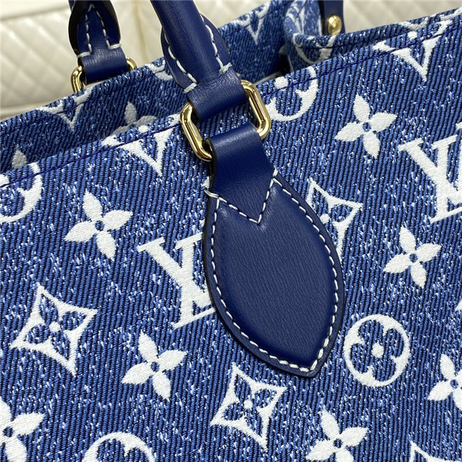 This Onthego MM tote looks fresh and fashionable this season, dressed in Monogram denim jacquard. The finely crafted textile is finished with a distinctive stone-washed effect, set off by tone-on-tone navy leather trim and contrasted white stitching. Its generous dimensions make this carryall ideal for work or weekend, carried either by its articulated top handles or long shoulder straps.