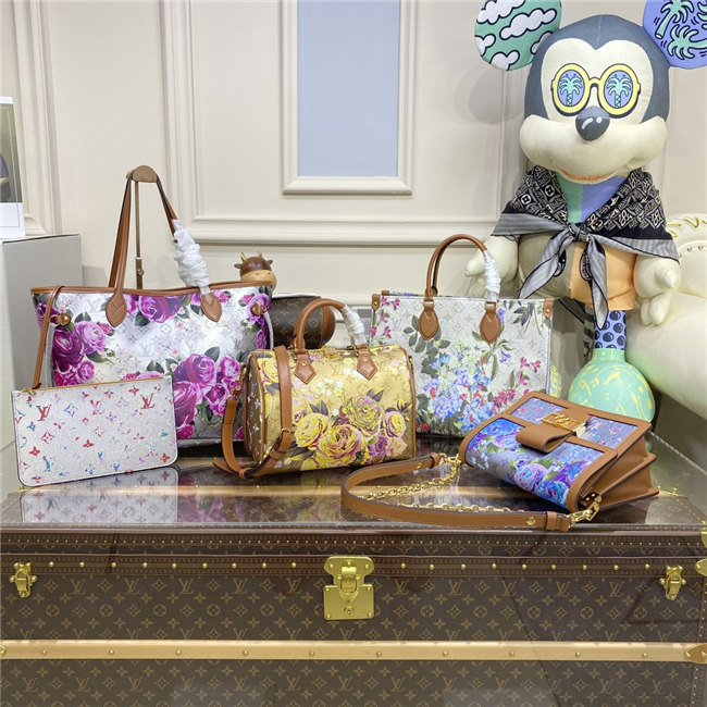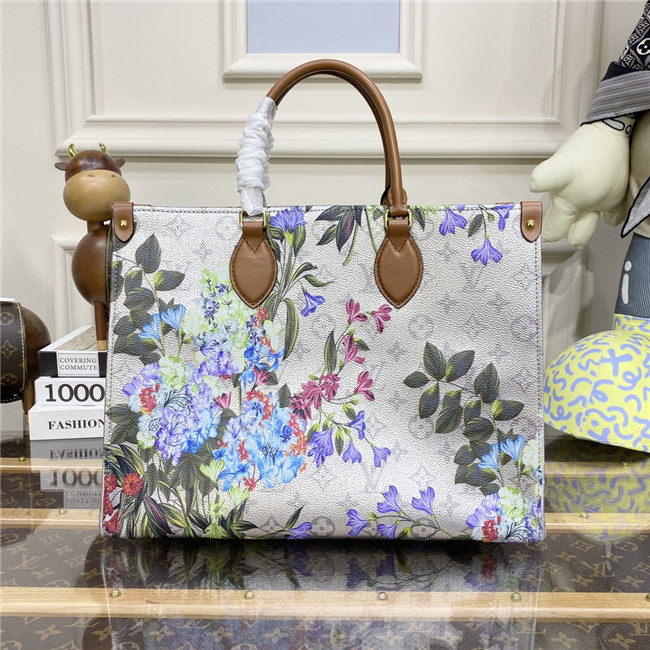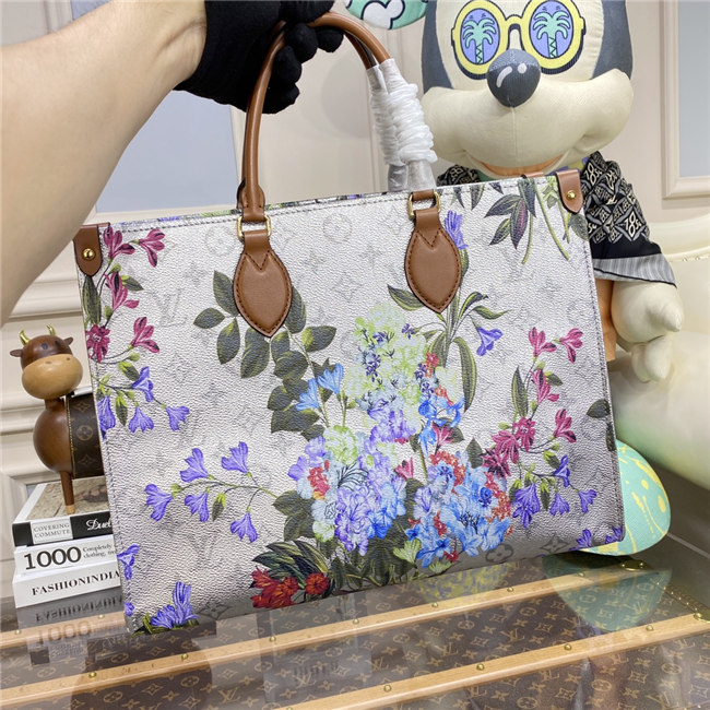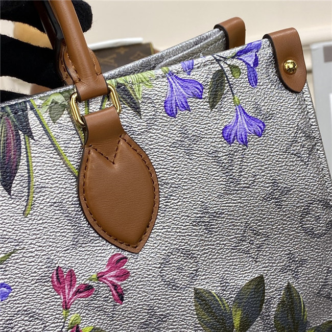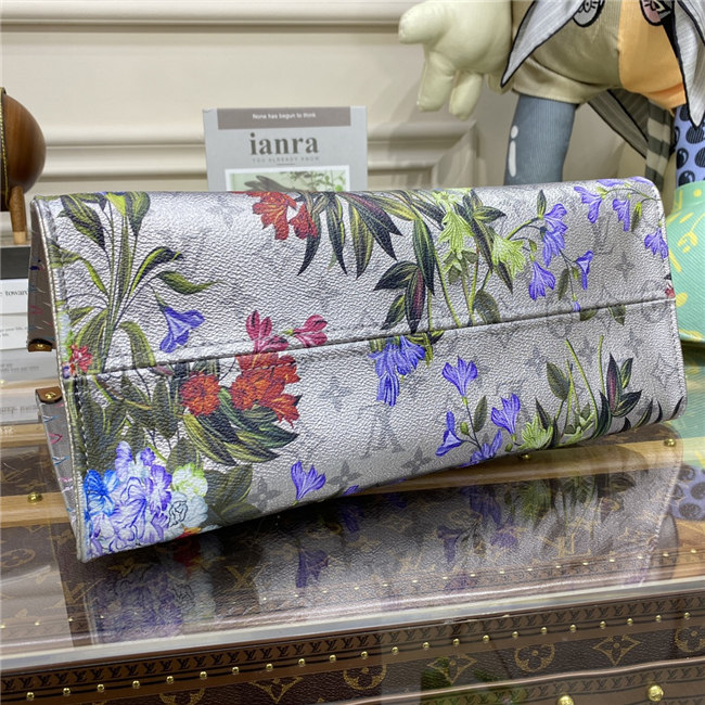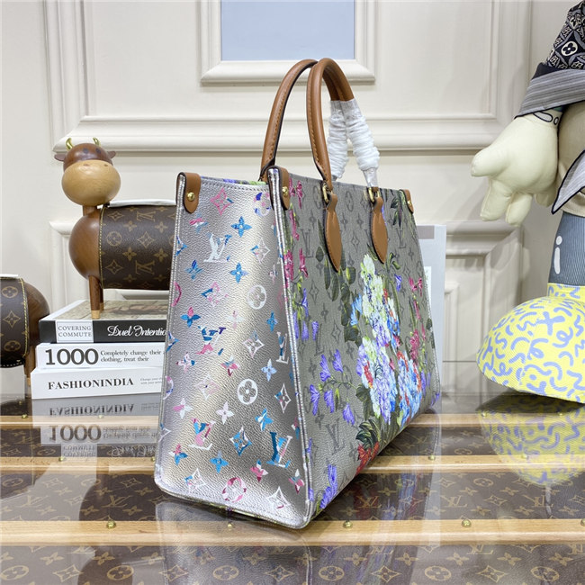 The hydrangeas Nicolas Ghesquière introduced on the Fall-Winter 2022 show bring feminine flair to this OnTheGo MM tote. This bold floral pattern is combined with a metallic-silver coated canvas and a subtle Monogram motif in the background. With a microfiber lining, this carryall is fitted with top handles and long leather shoulder straps.