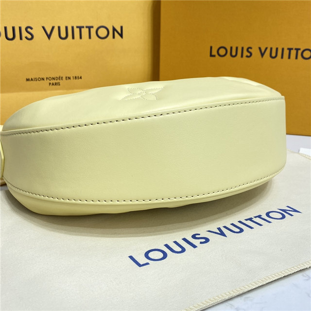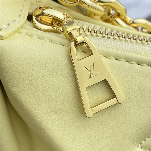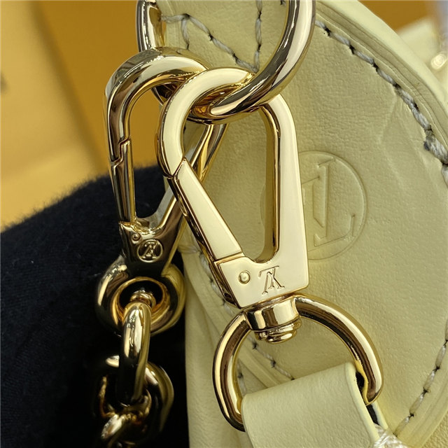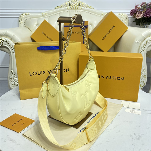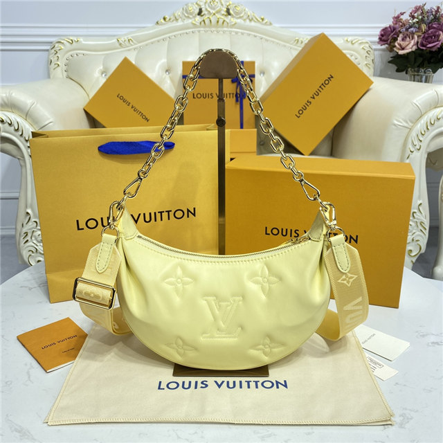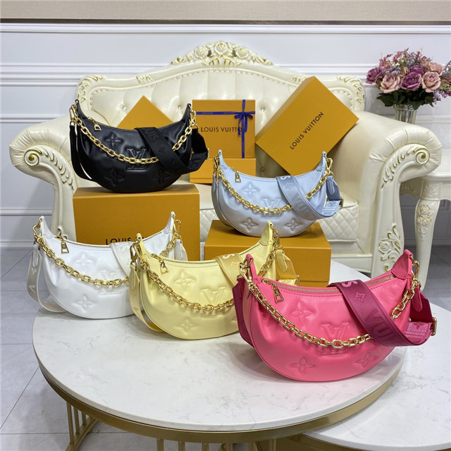 The Over The Moon delights with its versatile shape in quilted calf leather. The embroidered puffy Monogram pattern brings a statutory feel while the adjustable strap and gold-color chain deliver a myriad of carry options: elbow, short shoulder, cross-body, and long shoulder. With the strap removed, it can even be carried as an evening clutch.