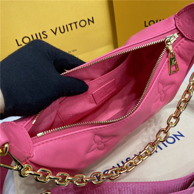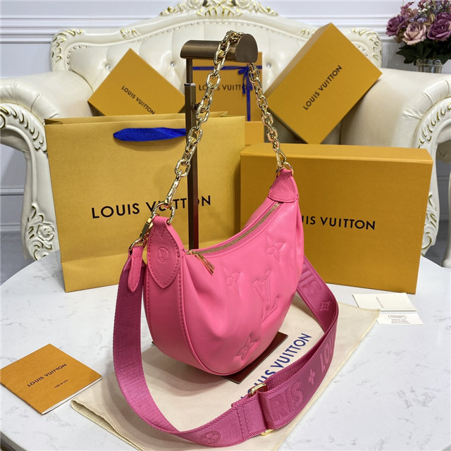 The Over The Moon delights with its versatile shape in quilted calf leather. The embroidered puffy Monogram pattern brings a statutory feel while the adjustable strap and gold-color chain deliver a myriad of carry options: elbow, short shoulder, cross-body, and long shoulder. With the strap removed, it can even be carried as an evening clutch.