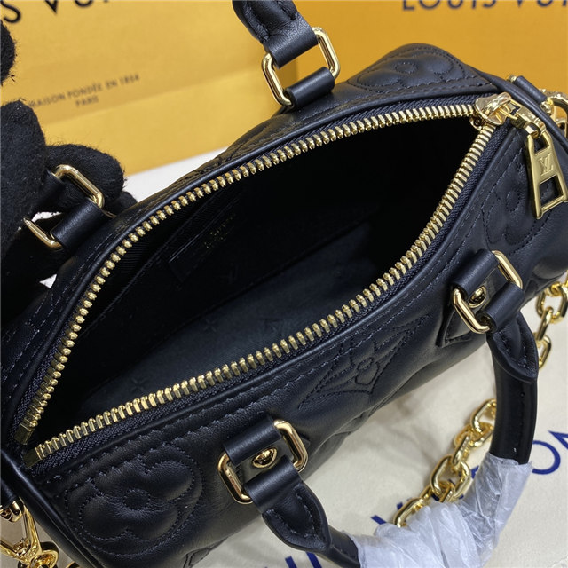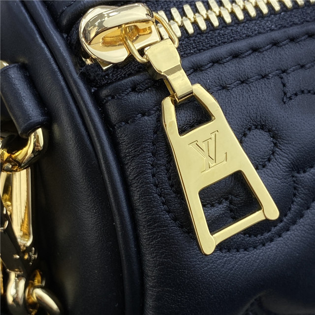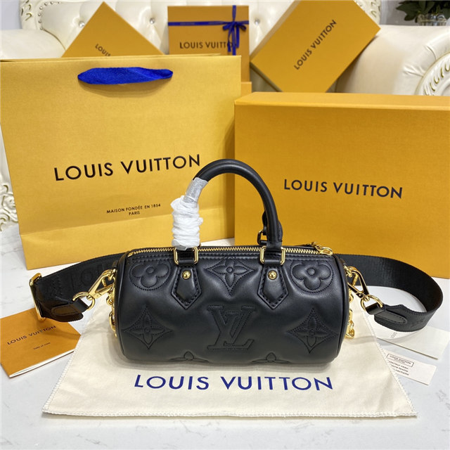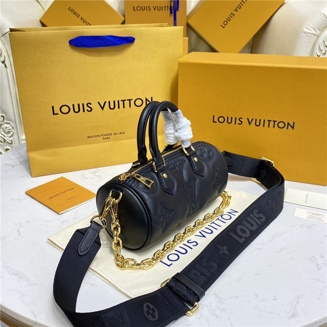 The compact, sporty Papillon BB handbag is made from soft, padded calf leather, embroidered with Louis Vuitton’s classic Monogram pattern. It features a removable gold-color chain in addition to a detachable shoulder strap and rolled leather top handles, enabling multiple ways of carrying the bag.