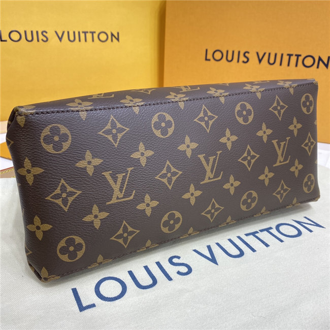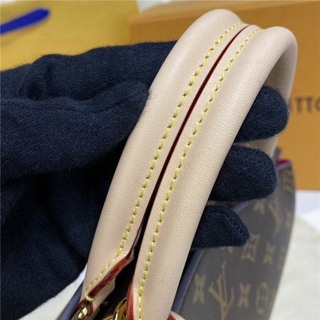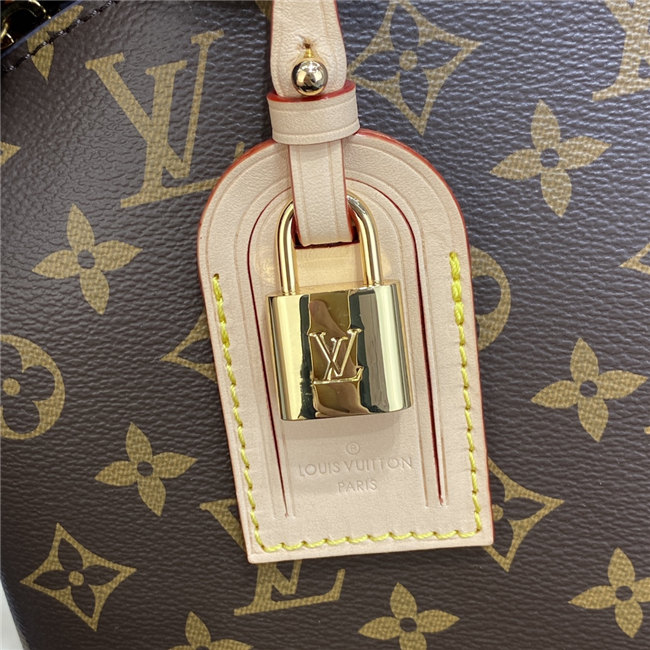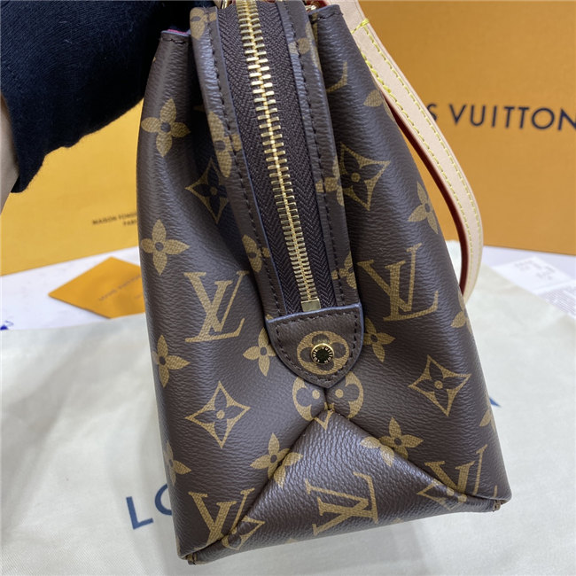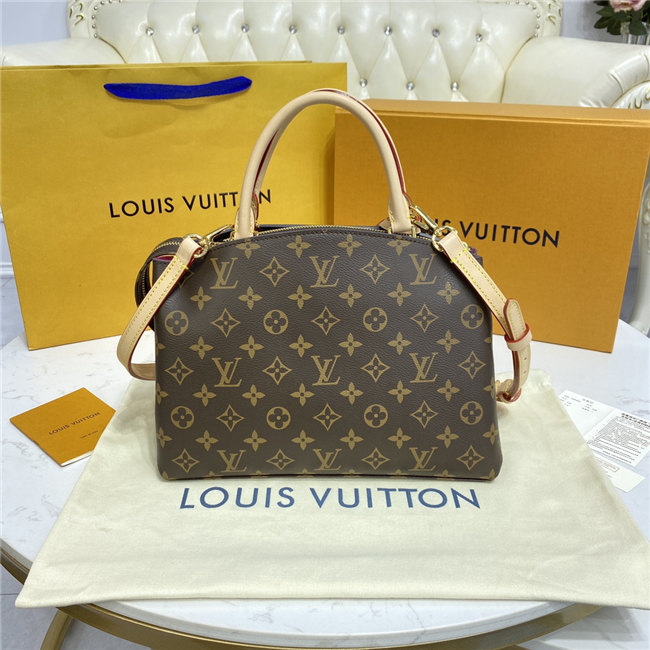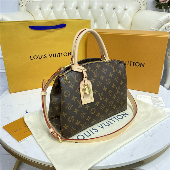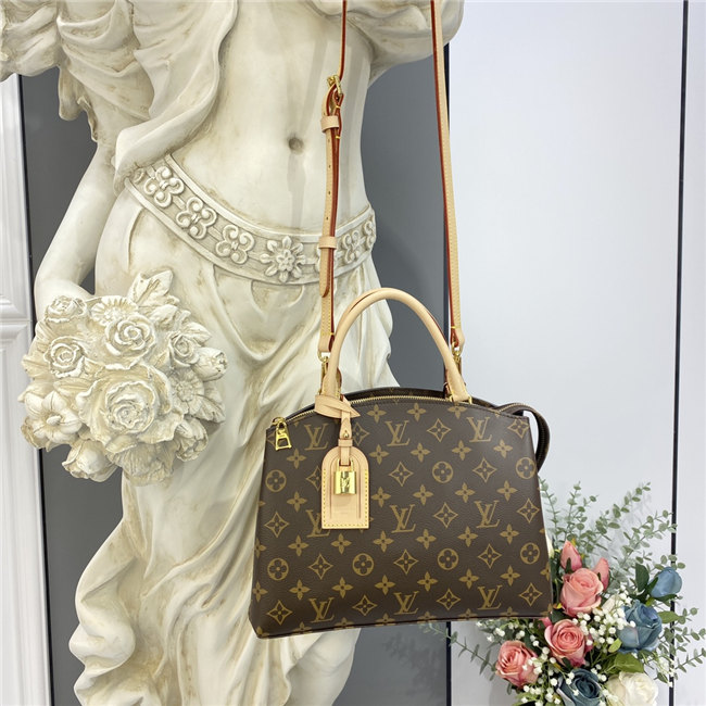 The timelessly feminine Petit Palais tote bag is made from Monogram canvas, trimmed with natural leather, and lined in a lush red textile. A removable and adjustable strap, in addition to Toron top handles, enables multiple carrying options. The gold-color padlock on the luggage tag evokes the House’s travel heritage