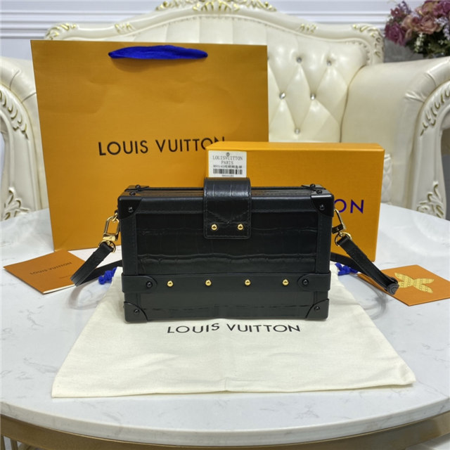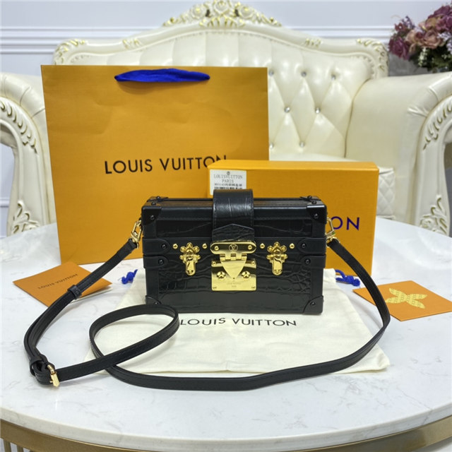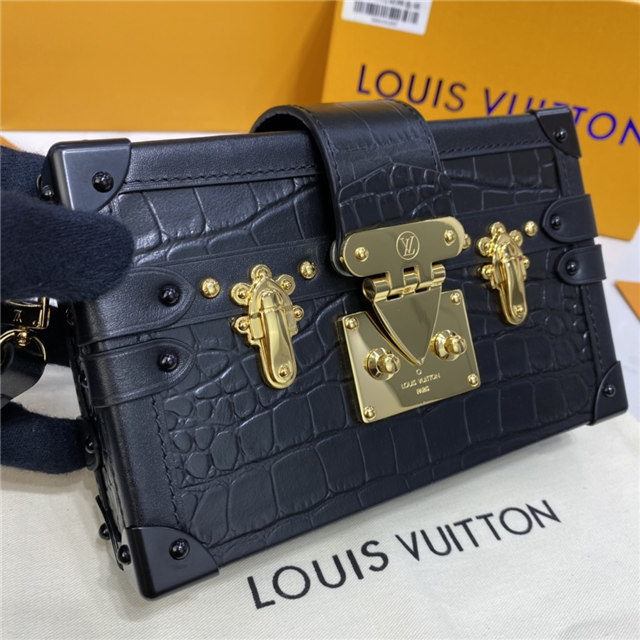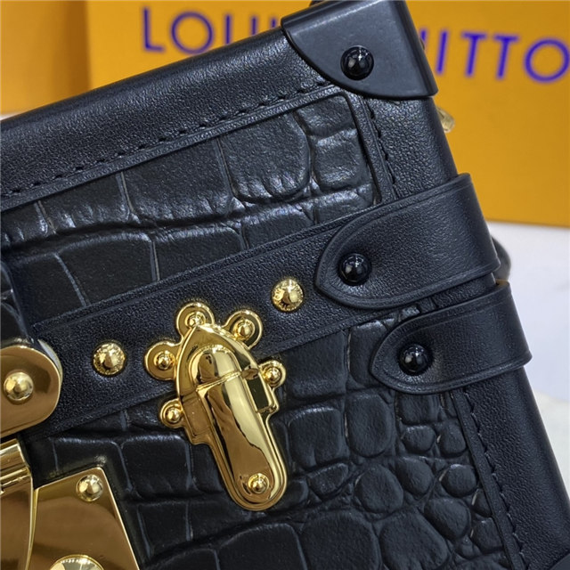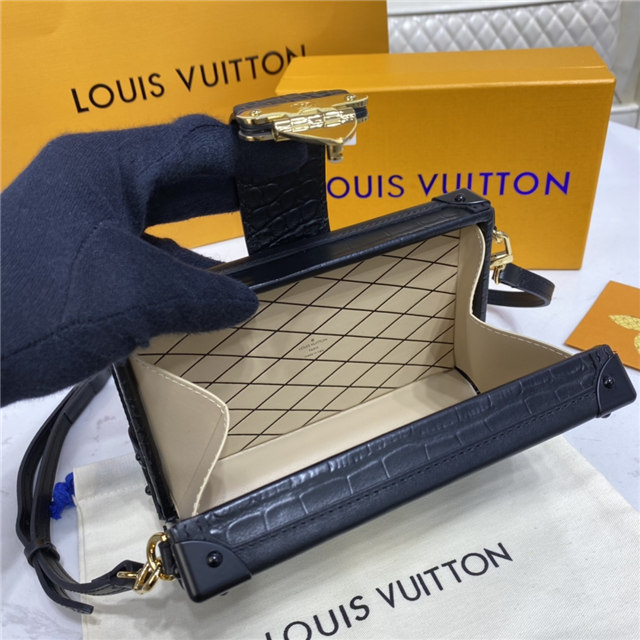 Nicolas Ghesquière reimagined the iconic fittings of historic House trunks to create the Petite Malle handbag. In precious crocodilian leather, this covetable “little trunk” travels elegantly from day into night.