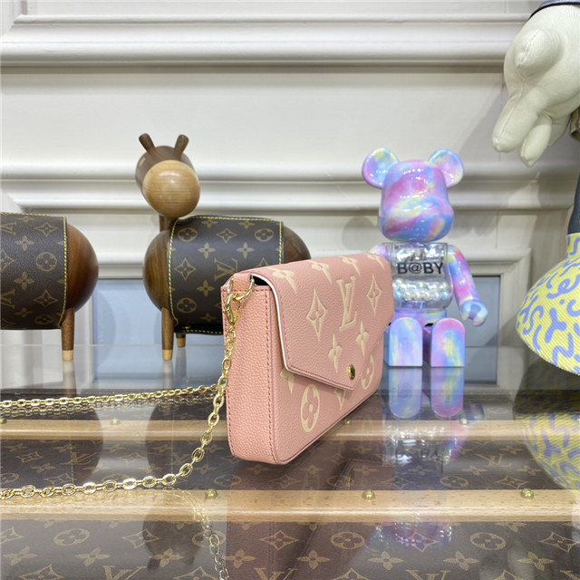 The Felicie Pochette is crafted from supple Monogram Empreinte leather, embossed with Louis Vuitton”s iconic Monogram pattern. The bicolor palette brings added refinement to this elegant and versatile design, which features a removable, gold-tone chain, enabling it to be carried on the shoulder or as a clutch, as well as two removable pockets.