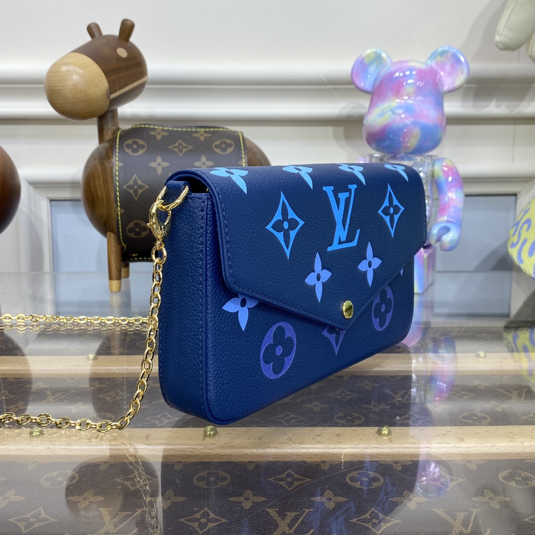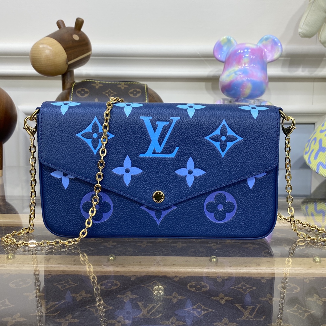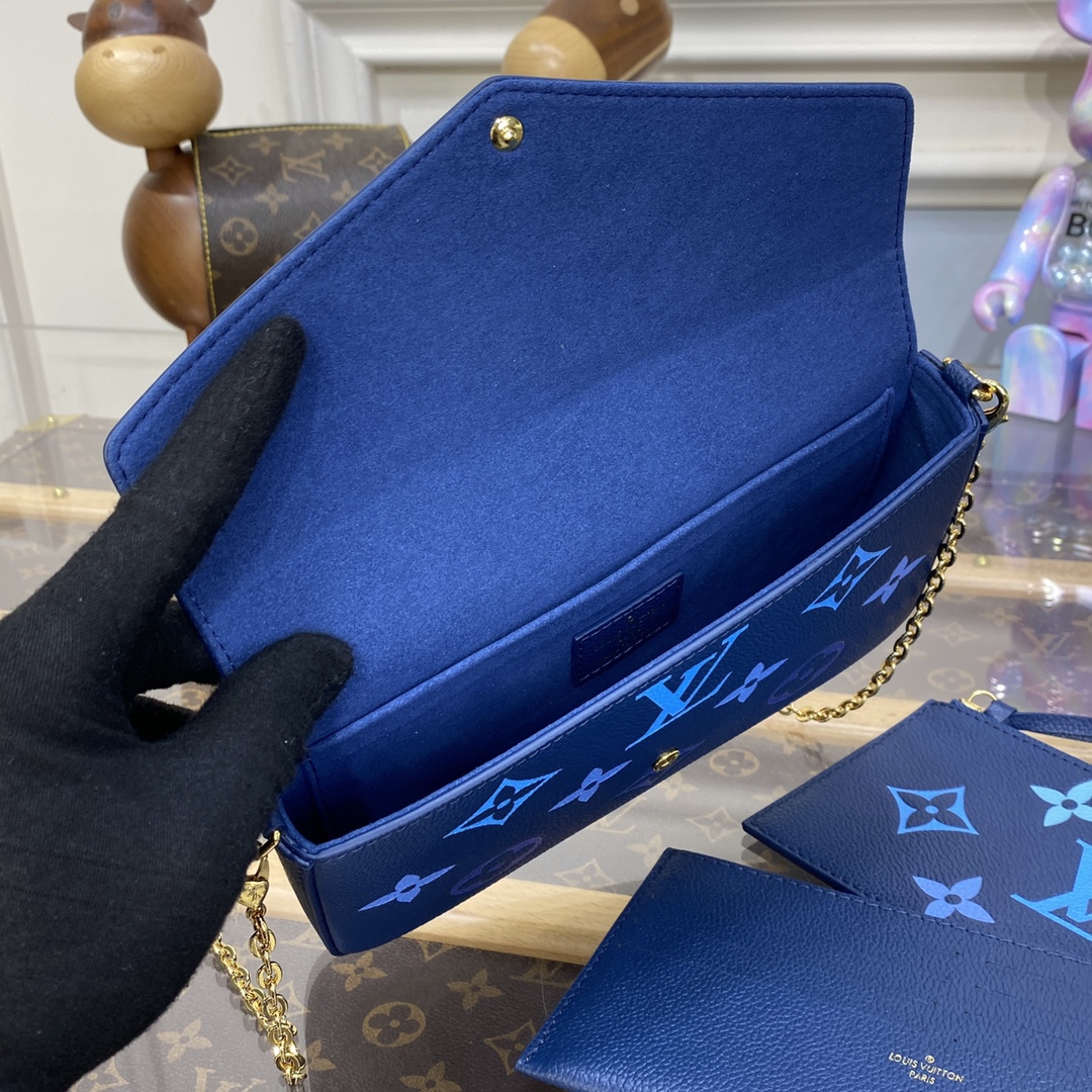 For the LV Gradient collection, the Félicie Pochette is revisited in supple, grained Monogram Empreinte leather, whose embossed Monogram pattern is printed with a gradation of ocean blues. This chic pouch comes with two removable pockets, including one with eight card slots. Its gold-tone chain can also be removed, enabling it to be carried as a clutch as well as a shoulder bag.