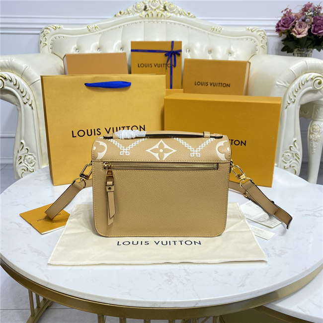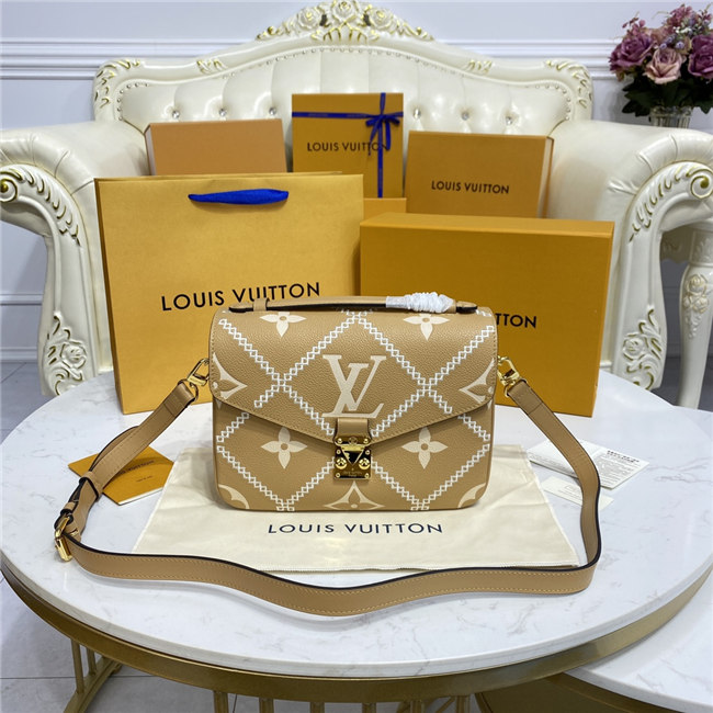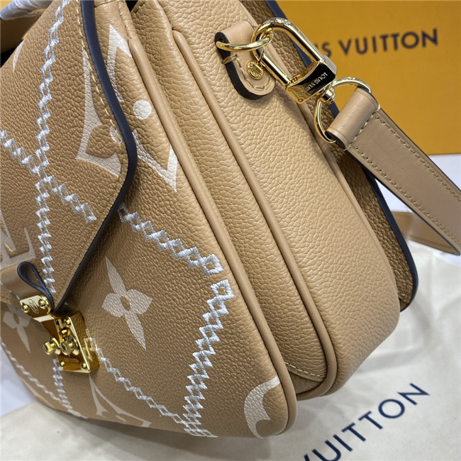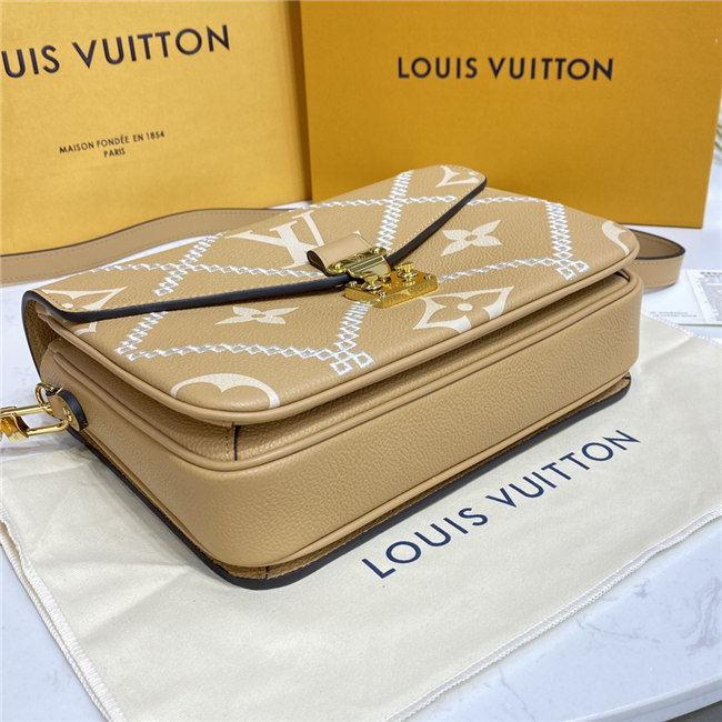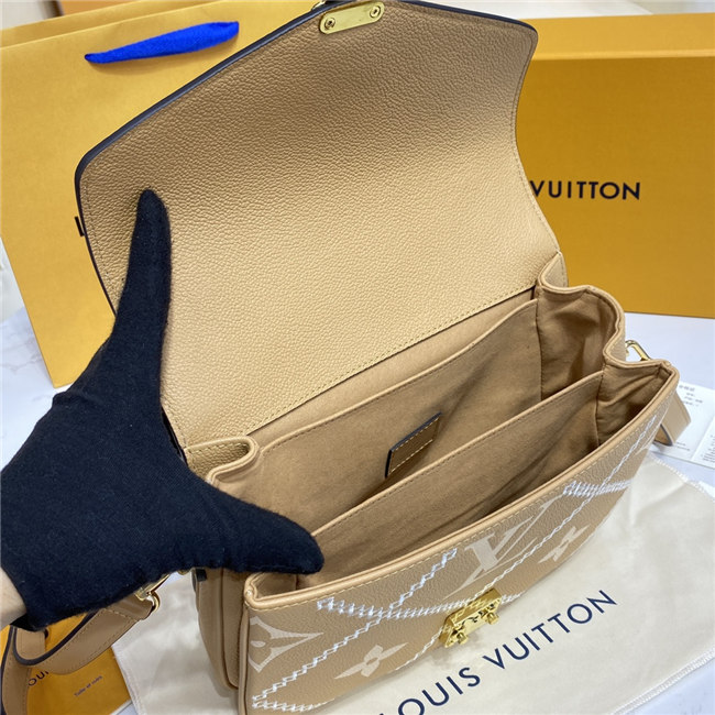 For Spring 2022 the Pochette Metis handbag in Monogram Empreinte leather is embellished with embroidery inspired by the quilted linings of original Louis Vuitton trunks. House craftsmanship shines in the colors and textures of the stitching against a background of embossed leather. This versatile statement piece features a convenient top handle and a removable cross-body strap.