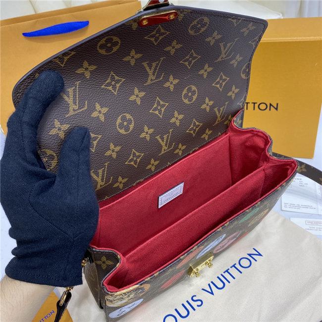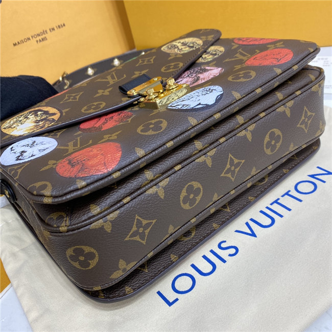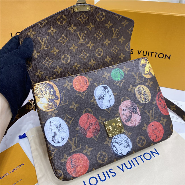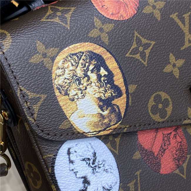 For the Fall-Winter 2020-21 Collection, Nicolas Ghesquière fashions the Pochette Metis handbag from Monogram canvas decorated with a slew of colorful cameo prints, directly inspired by the work of Italian artist Piero Fornasetti. The black-leather top handle and cross-body strap enable a variety of comfortable carry options.