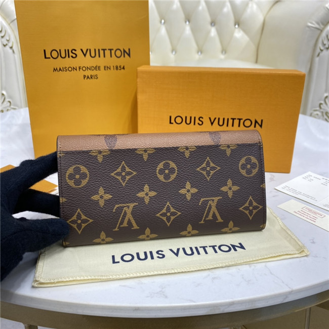 The Sarah wallet is revisited in an elegant combination of Monogram and Monogram Reverse Giant canvas. This classic, rectangular wallet is notable for its well-organized interior featuring an array of pockets and card slots. Its envelope-style flap is secured with an engraved, gold-tone press-stud.