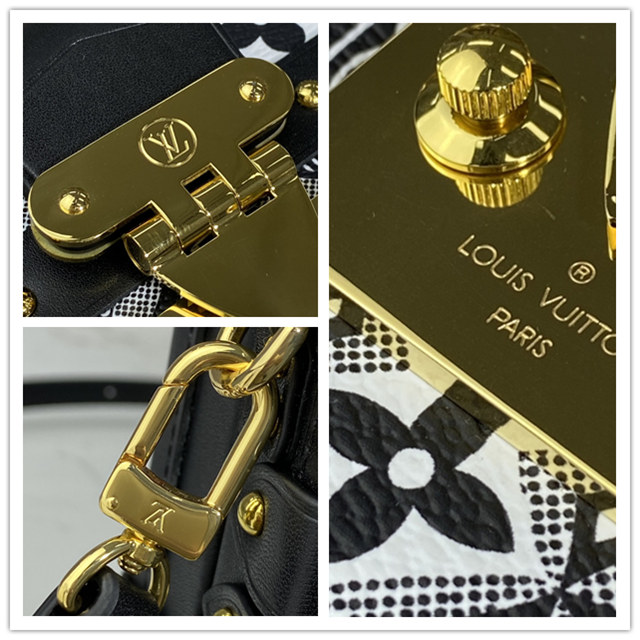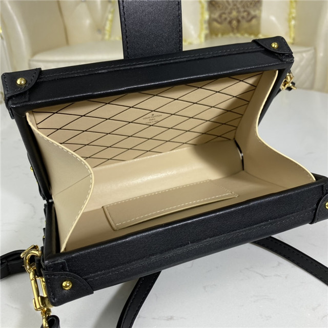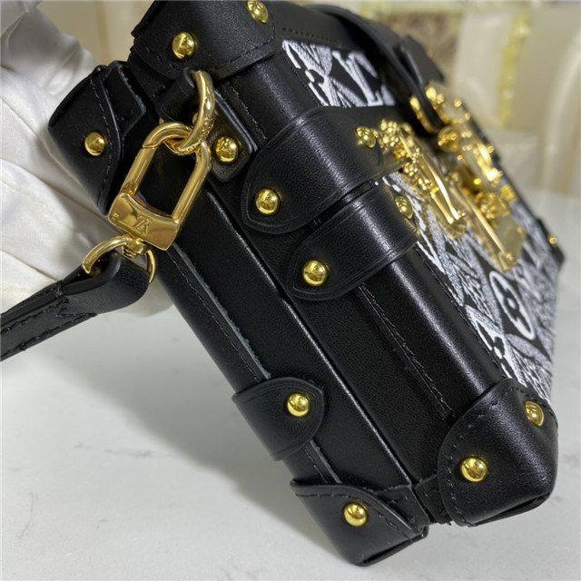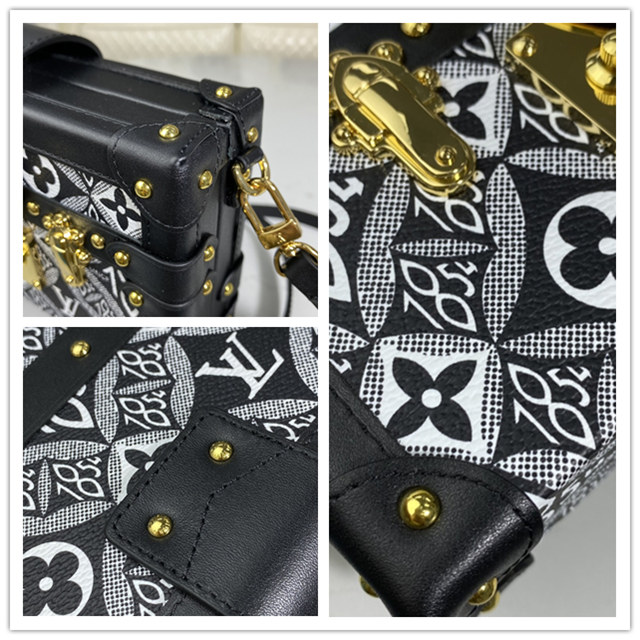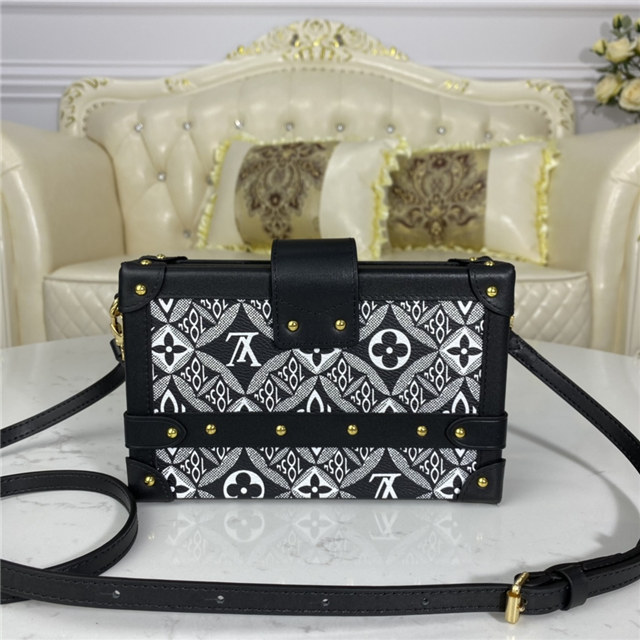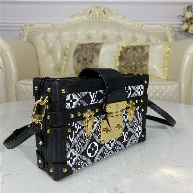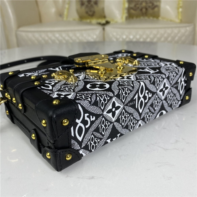 The Petite Malle handbag takes on a neo-vintage aspect in new Jacquard Since 1854 textile. The pattern of woven Monogram Flowers, LV Initials, and 1854s was seen across the whole Fall-Winter 2020 Collection. The number 1854 refers to the year Louis Vuitton founded his trunk-making business. The Petite Malle travels easily from day to evening.