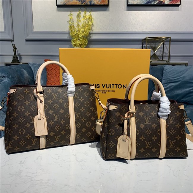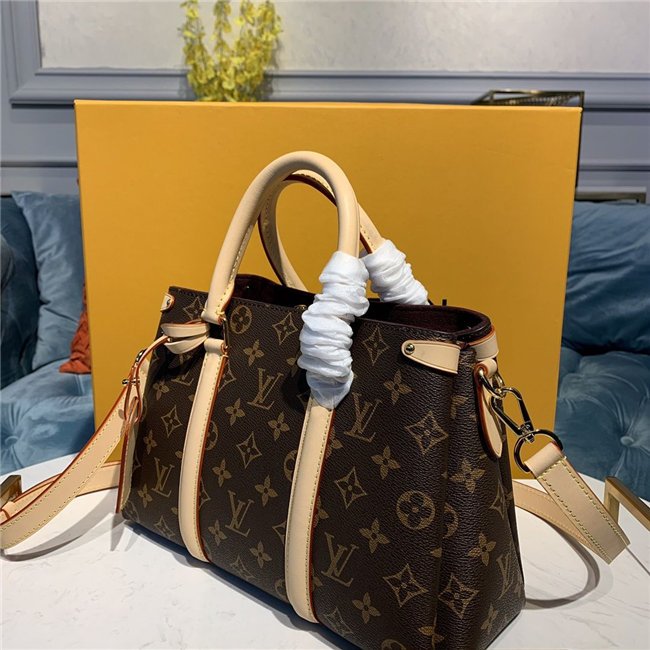 The adorably sized Soufflot BB is made from Monogram canvas and features classic House details such as the two smooth-leather bands on the side, gold-color rivets, and the iconic leather nametag. It can be carried by hand with its top handles or on the shoulder and cross-body thanks to its removable and adjustable shoulder strap.