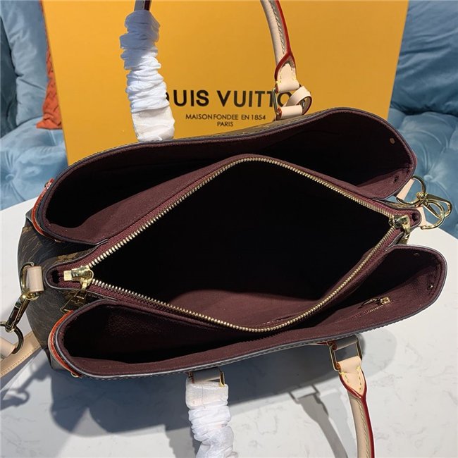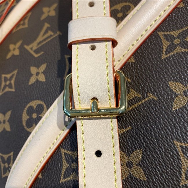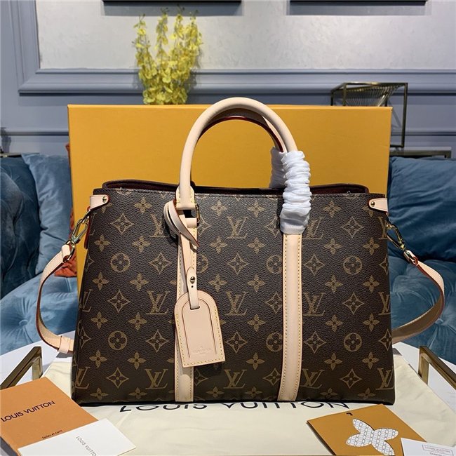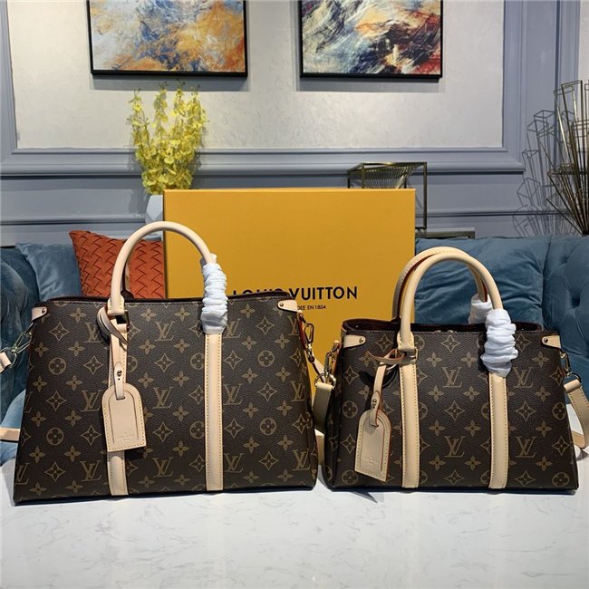 Made from Monogram canvas and featuring two lateral leather bands inspired by the iconic Keepall, the new Soufflot MM has a spacious, well-organized interior. It can be carried by hand and on the elbow with its articulated leather top handles, or on the shoulder, thanks to its removable and adjustable shoulder strap.