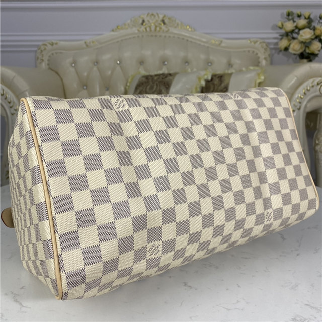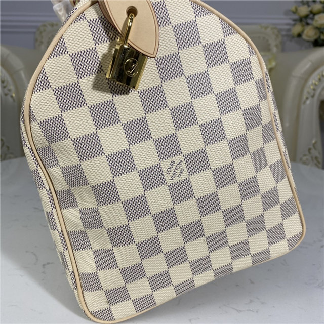 Crafted from feminine Damier Azur canvas, the Speedy 35 is a stylish handbag for both travel and daily use. Launched in 1930 as the “Express” and inspired by that era”s rapid transit, today’s updated Speedy remains a timeless House icon, with its unmistakable silhouette, rolled leather handles and engraved, signature padlock.