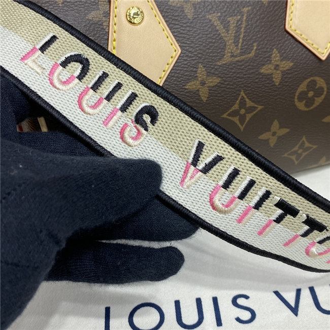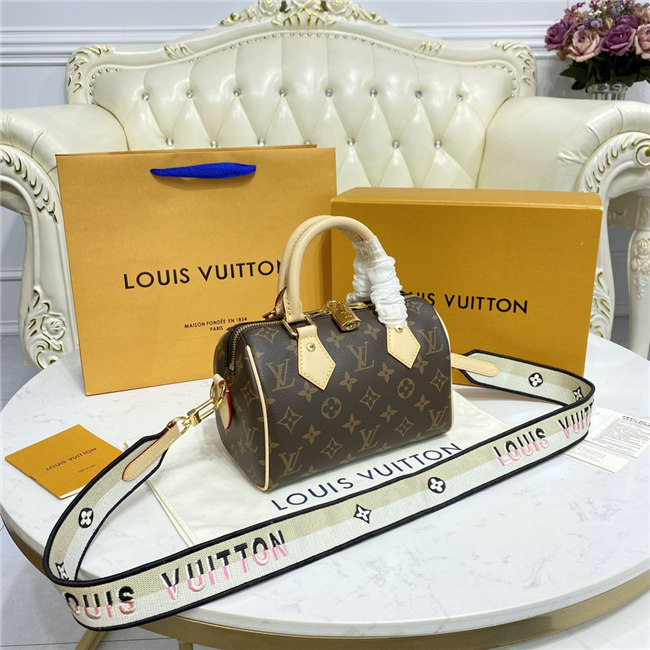 Like a diminutive version of the House’s historic Speedy travel bag, the Speedy Bandoulière 20 handbag is crafted from Monogram canvas with natural cowhide trim. In addition to the rolled leather top handles, there’s a wide detachable textile strap with a woven Louis Vuitton signature. This bag’s classic design is completed with red textile lining.