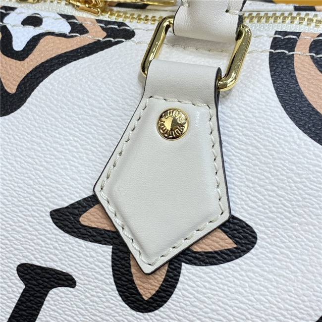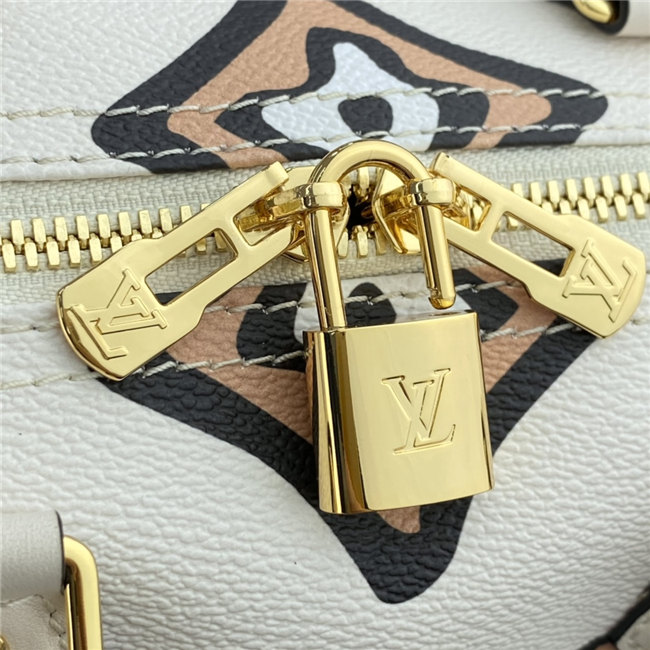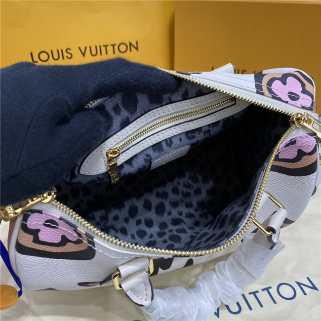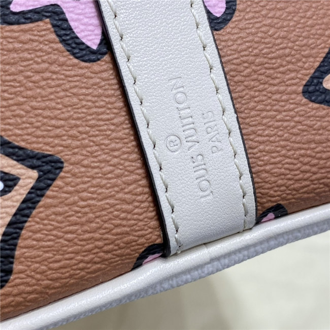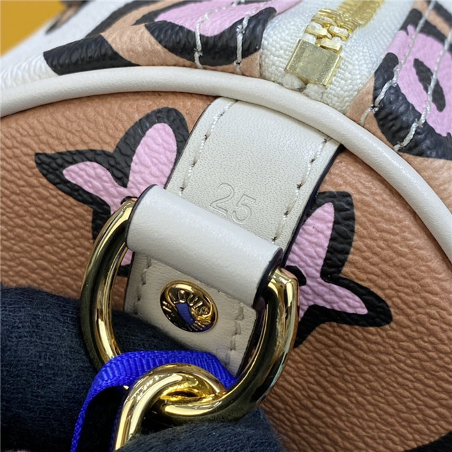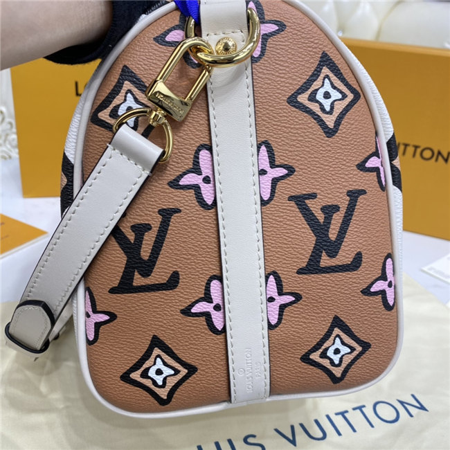 This Speedy Bandoulière 25 handbag comes from the Fall 2021 Wild at Heart capsule. The classic shape is dressed in an exclusive Monogram print with a striking hand-painted look, inspired by an archival House motif from 1924. Because they play out as neutrals, the bag”s luminous autumnal colors create a stylish complement for the season’s silhouettes.