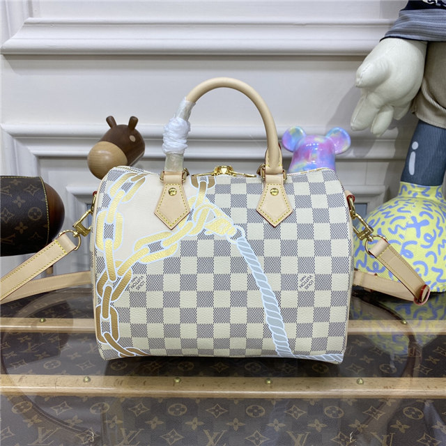 The Speedy Bandoulière 25 handbag gets a summery makeover in Damier Azur canvas decorated with a bold nautical print. The 5-color serigraphy of chains and ropes with golden highlights brings a distinct resort feel to the bag. Two rolled-leather top handles and a removable and adjustable strap give carry options.