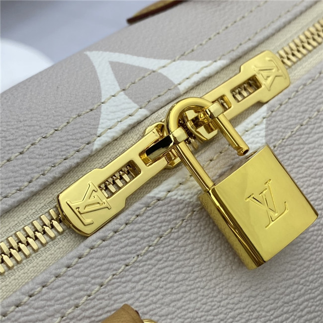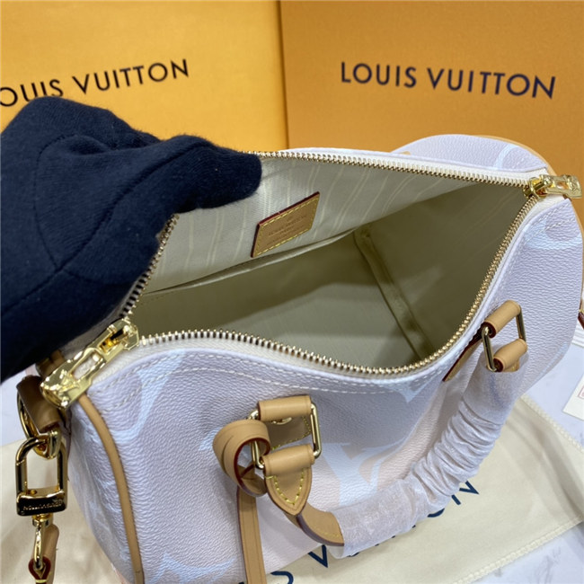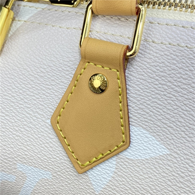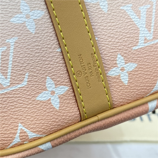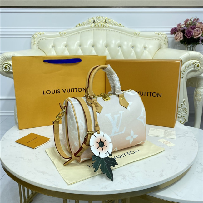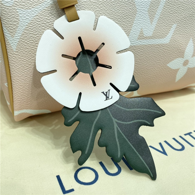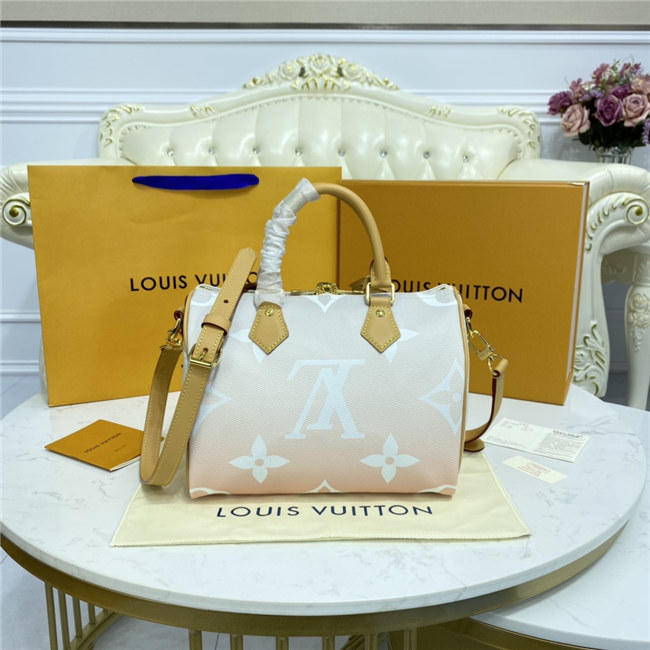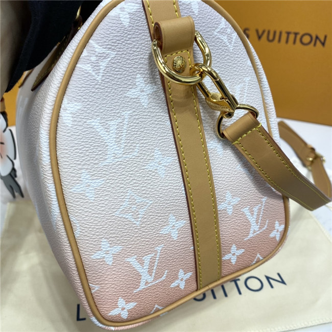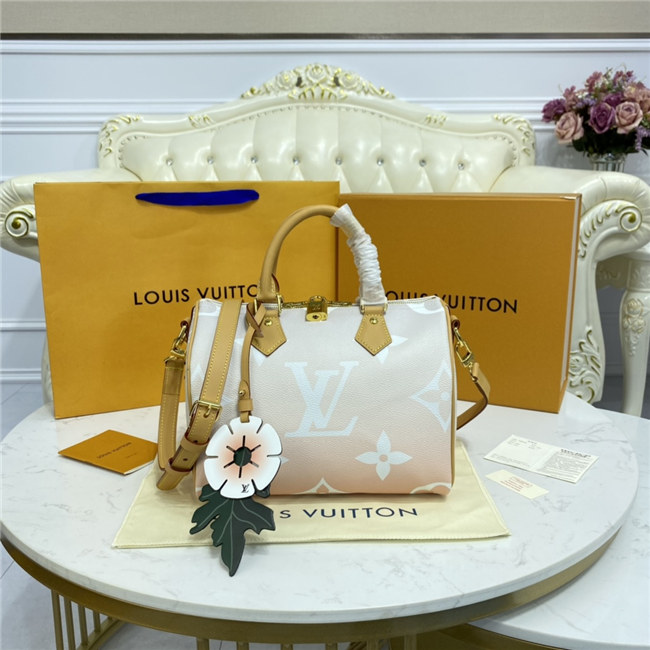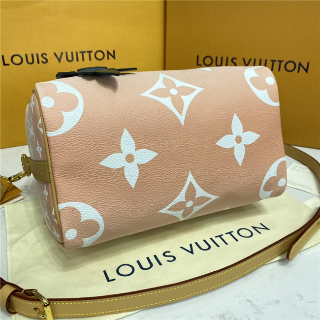 Fashioned from gradient pastel Monogram Giant canvas, the compact Speedy 25 is an elegant handbag, ideal for urban life. Introduced in 1930 as the “Express” and inspired by that era”s increasingly swift transportation options, today’s updated Speedy is accessorized with a leather flower charm.