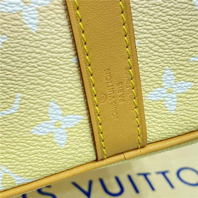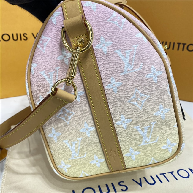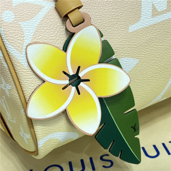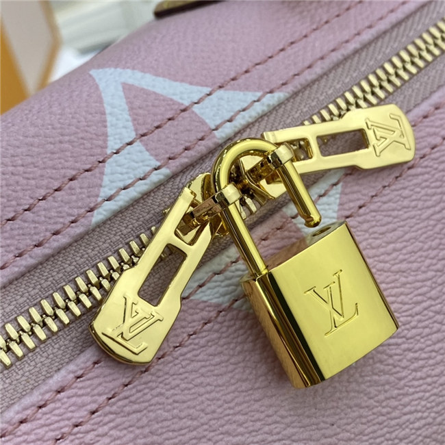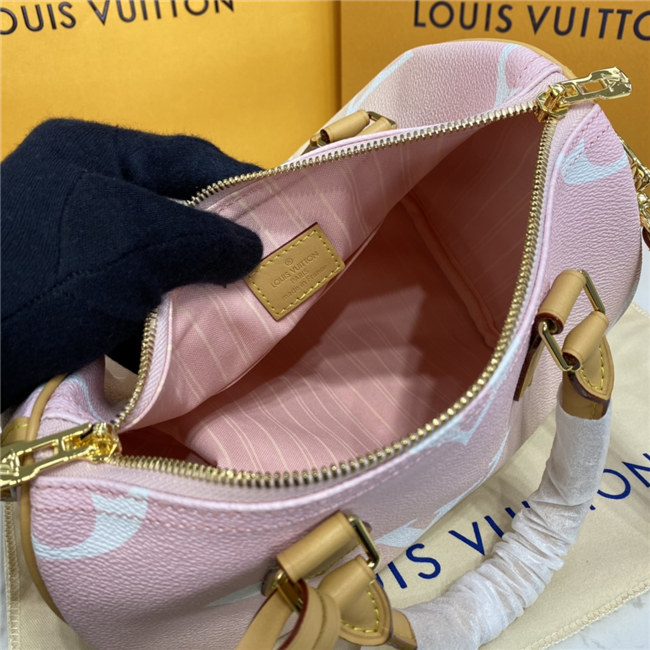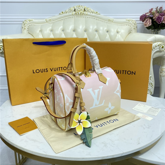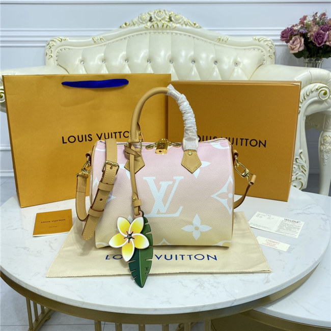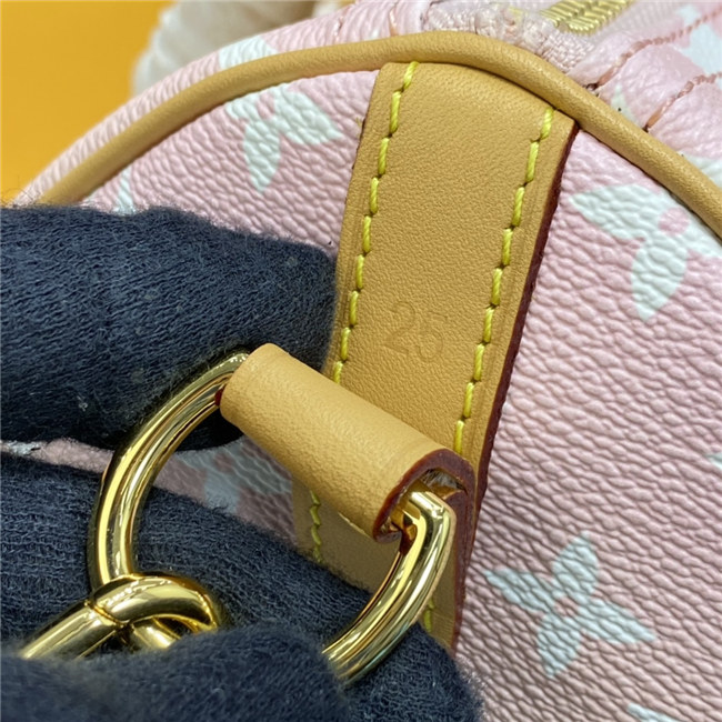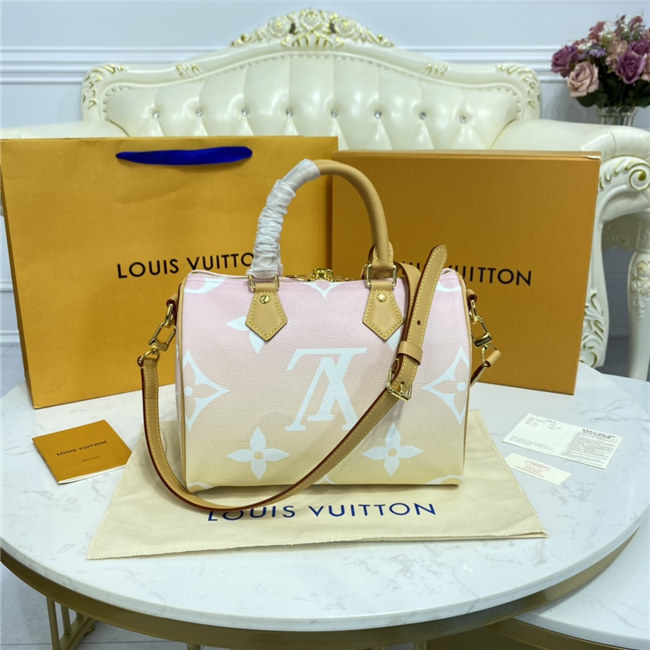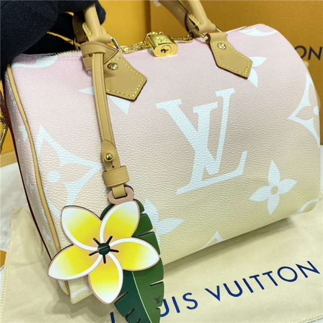 Fashioned from gradient pastel Monogram Giant canvas, the compact Speedy 25 is an elegant handbag, ideal for urban life. Introduced in 1930 as the “Express” and inspired by that era”s increasingly swift transportation options, today’s updated Speedy is accessorized with a leather flower charm.