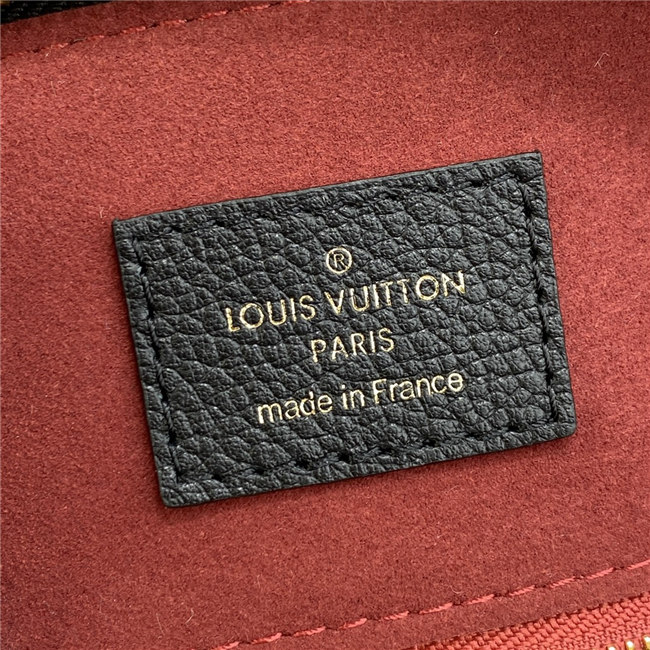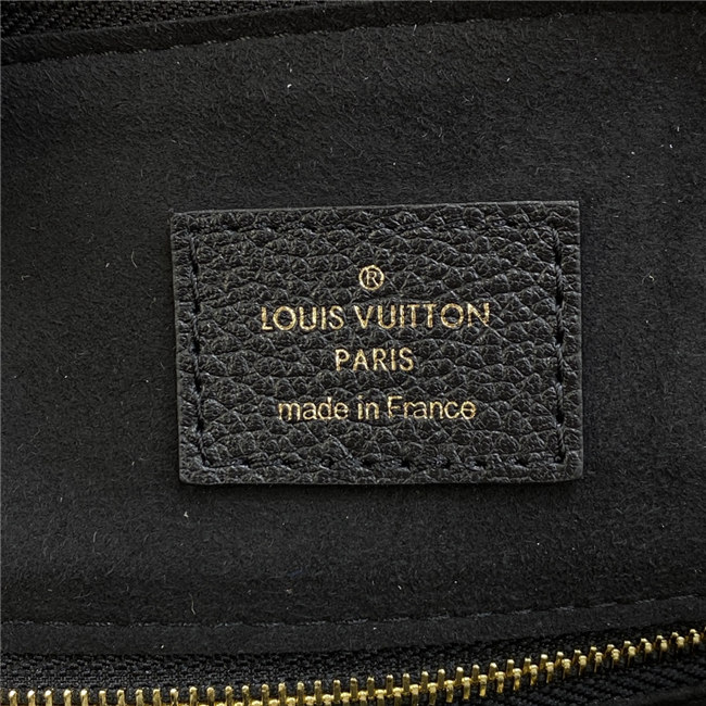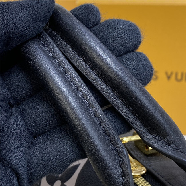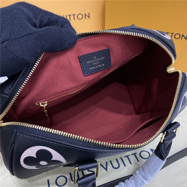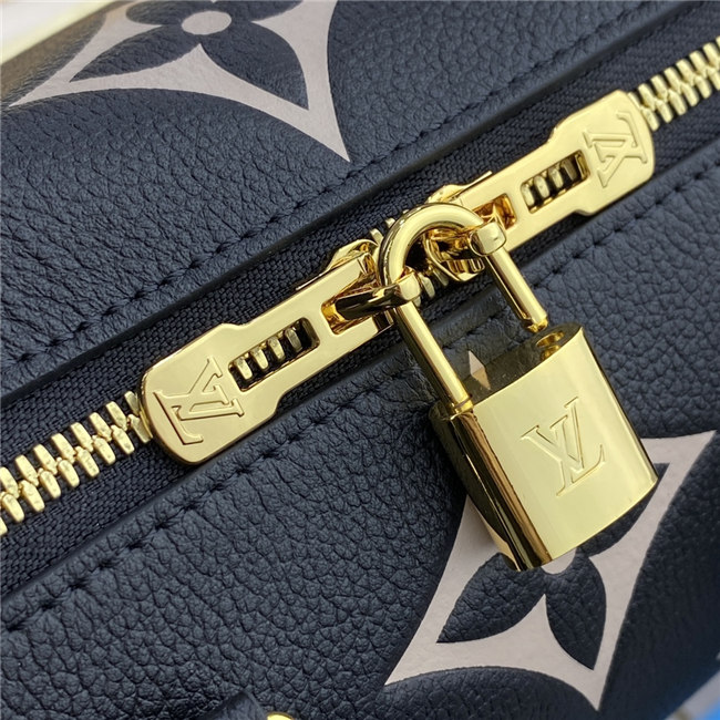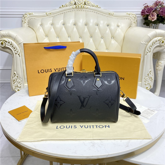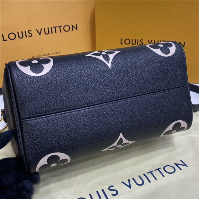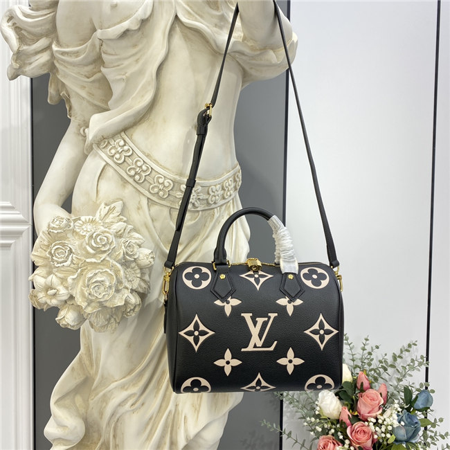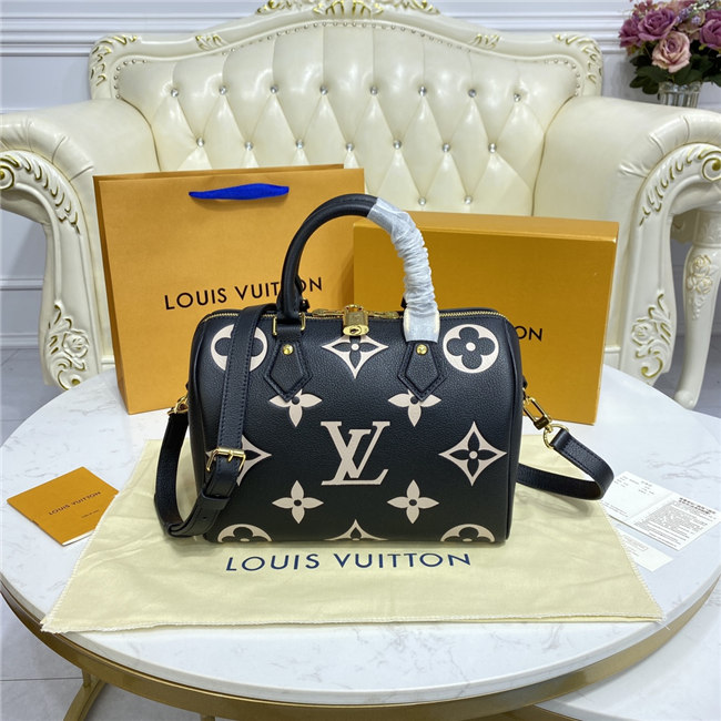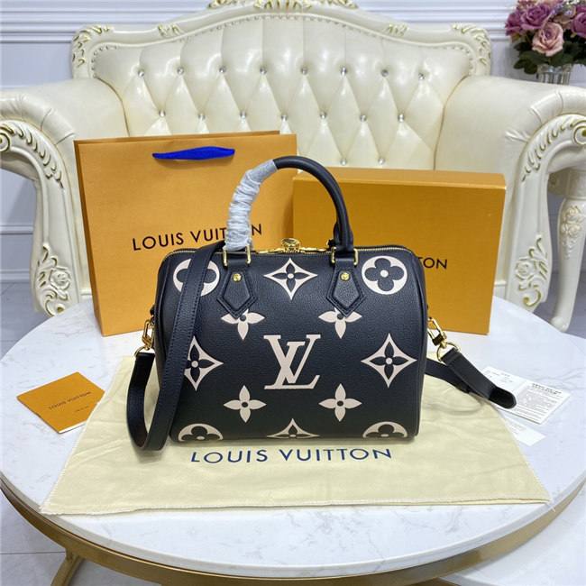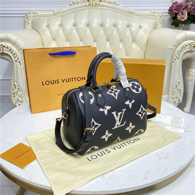 The compact Speedy Bandoulière 25 handbag is made from black Monogram Empreinte leather with the embossed Oversized Monogram pattern in beige. This sophisticated handbag was inspired by the House’s “Express” bag from 1930. Finished with gold-color hardware, the interior is lined in red. A detachable and adjustable shoulder strap, in addition to the top handles, enables carry options.