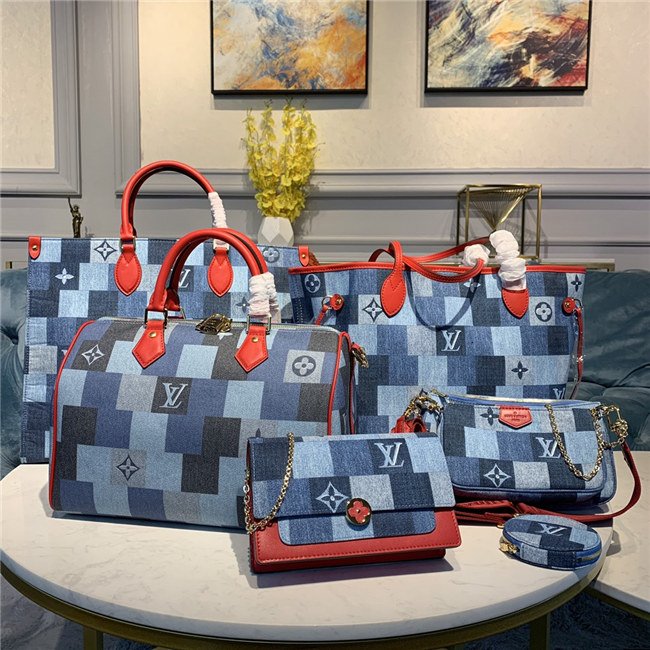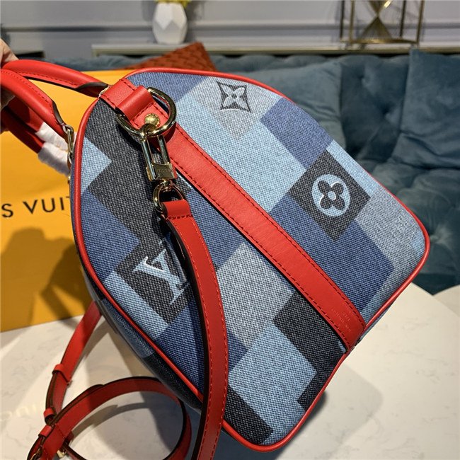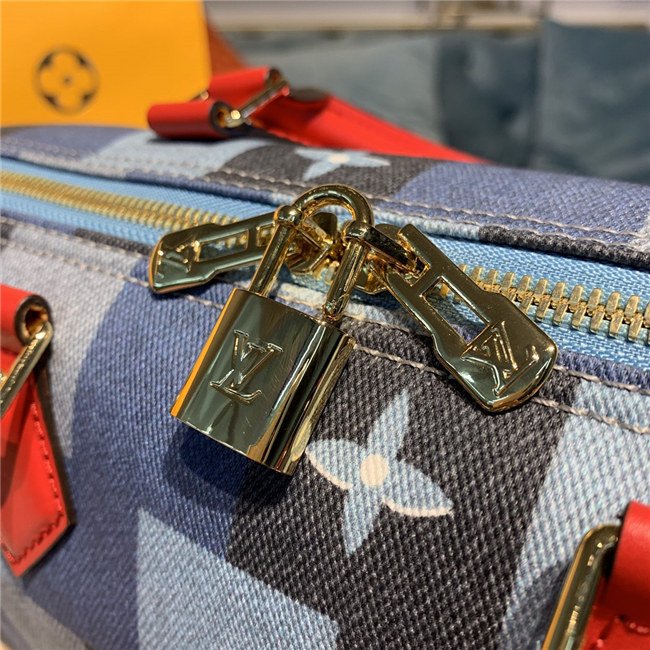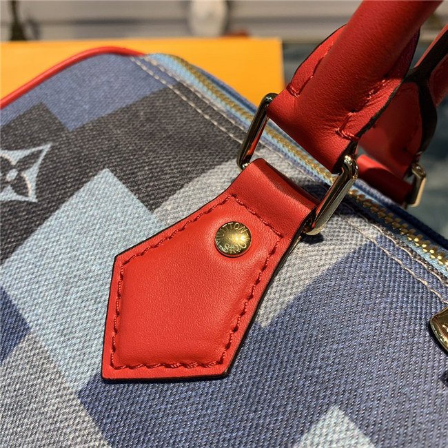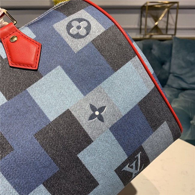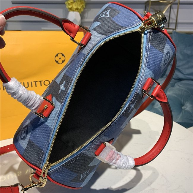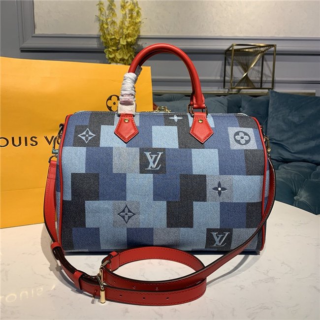 A patchwork pattern in shades of denim blue give the iconic Speedy Bandoulière 30 a fashionable allure. Printed directly on the canvas, the combination of Damier and Monogram motifs creates an illusion of texture, for a modern, crafted look. The handles and strap in bright red leather add punch to a perfect casual-chic companion.