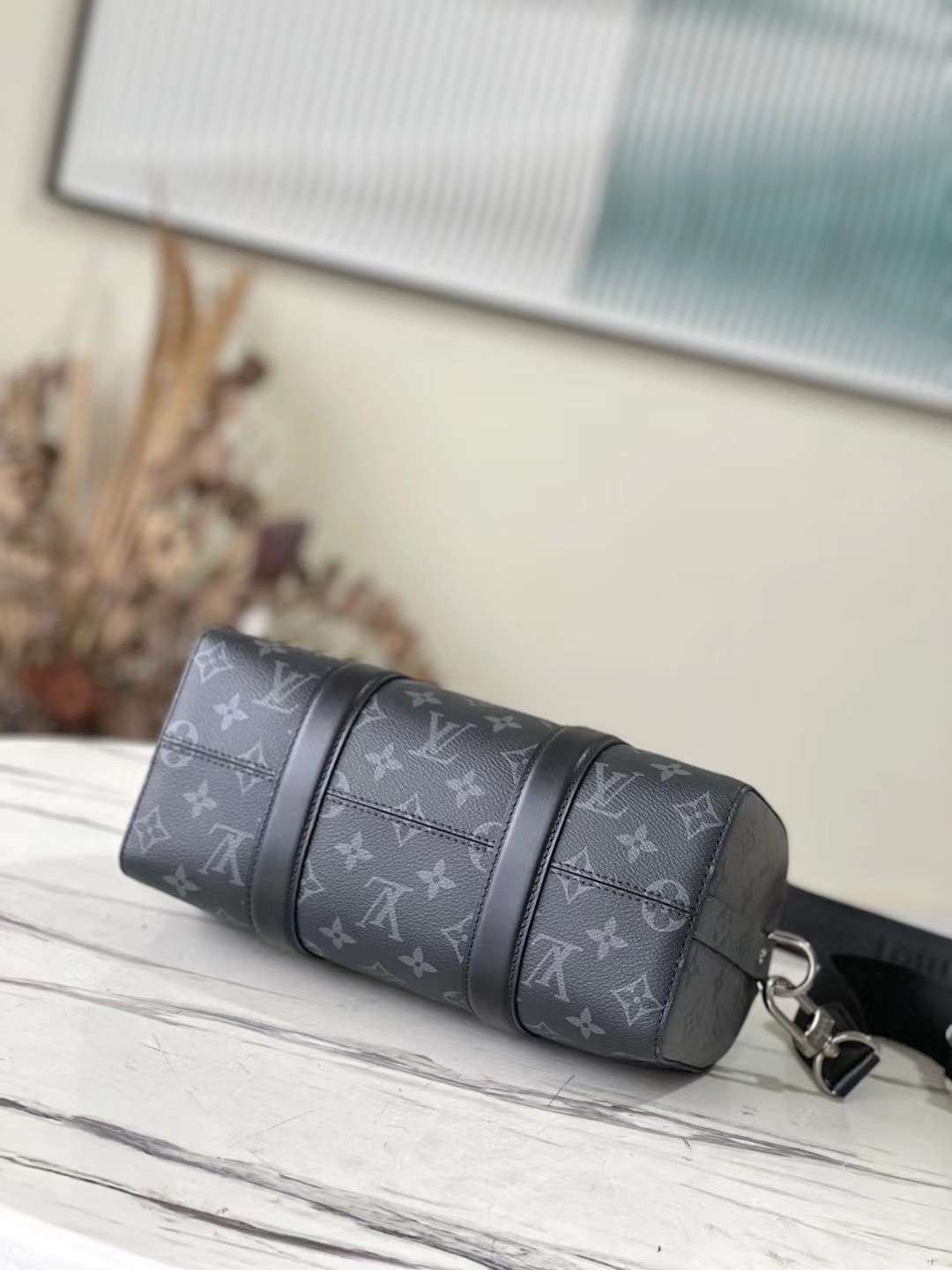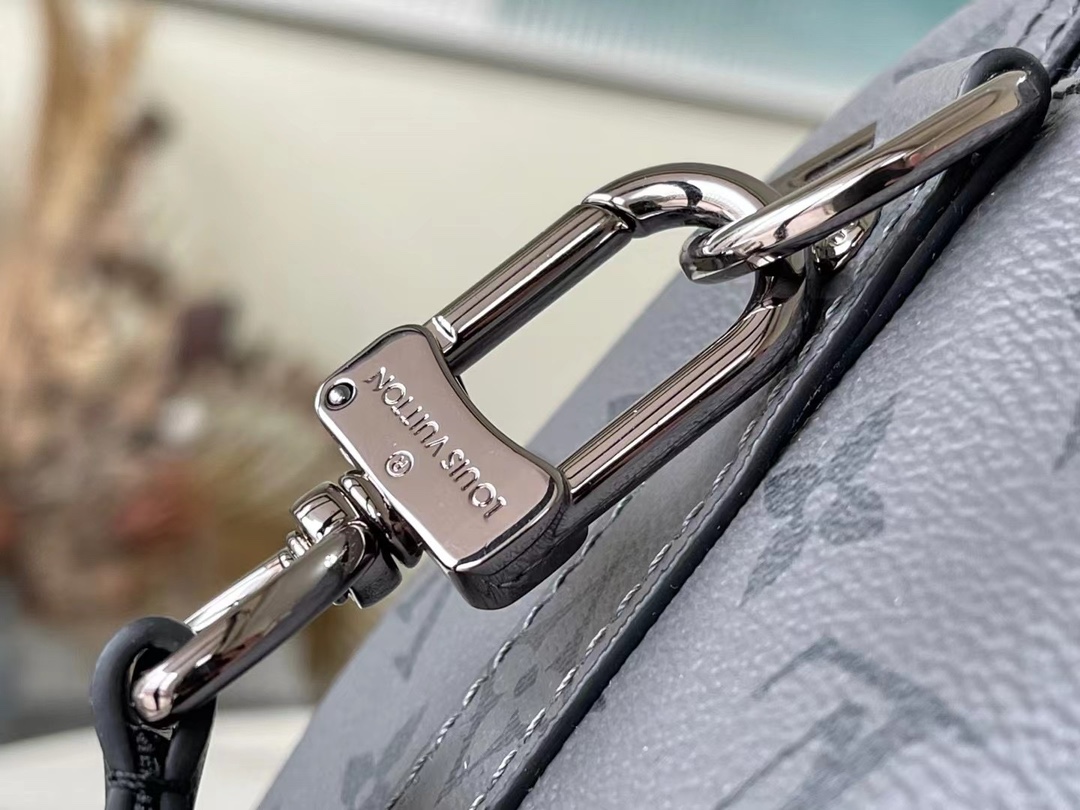 Introducing the LOUIS VUITTON Travel Bag in gray, the Keepall. This bag embodies a condensed classic design, making it a trendy urban handbag. The side design features an intriguing inverted effect of the Monogram pattern, cleverly echoing Kim Jones’ Upside Down collection from 2018. The Monogram Eclipse canvas body is paired with a detachable shoulder strap, allowing for effortless carrying of daily essentials.