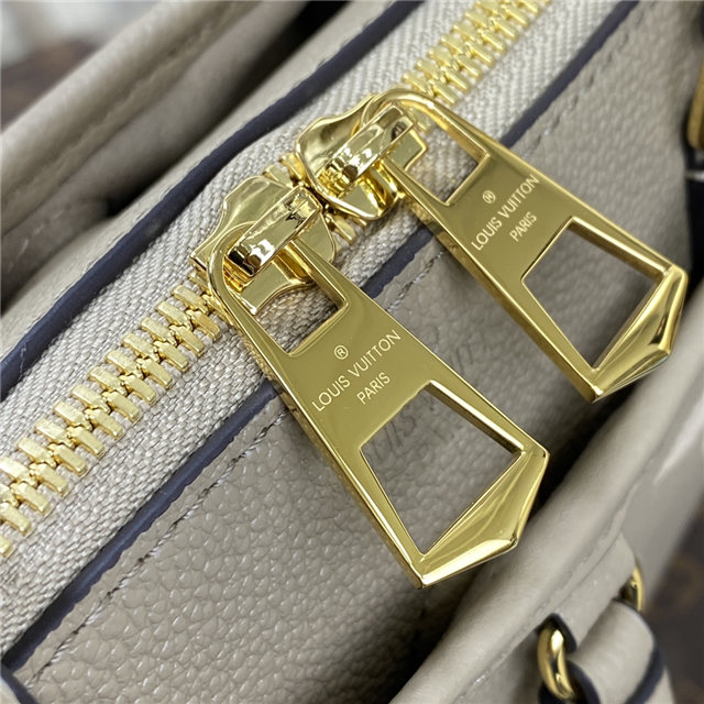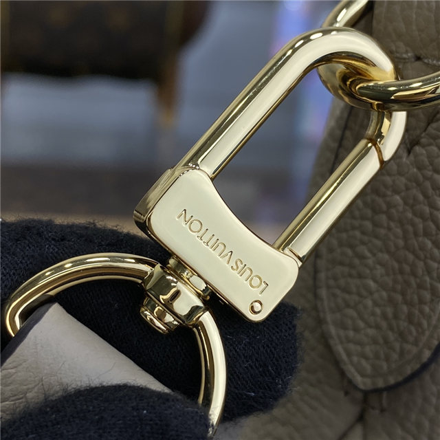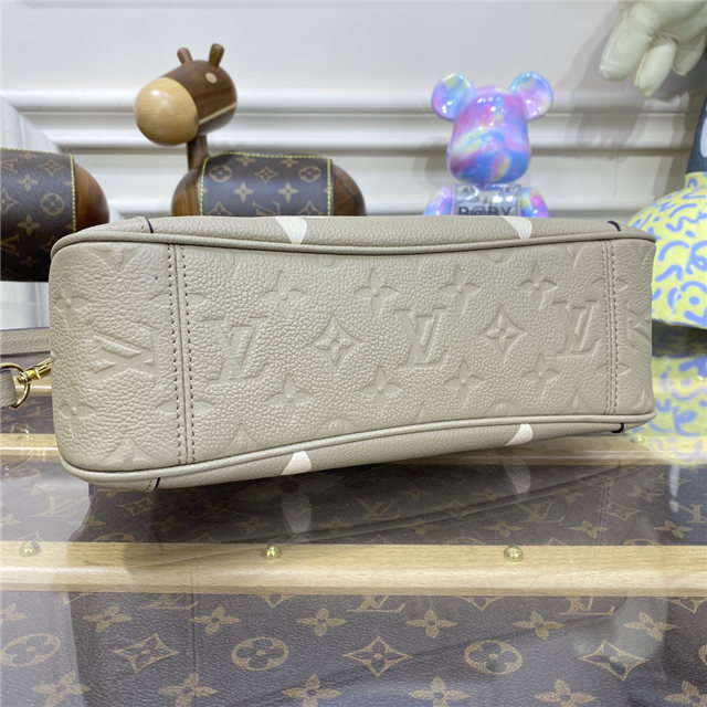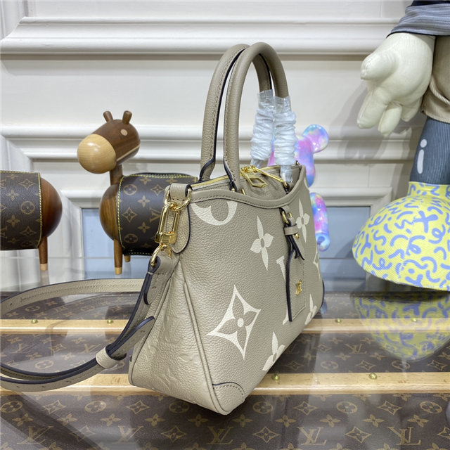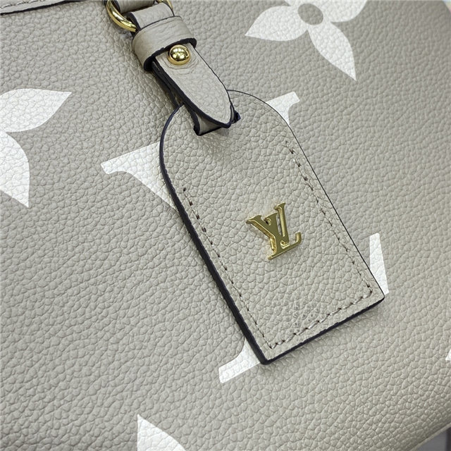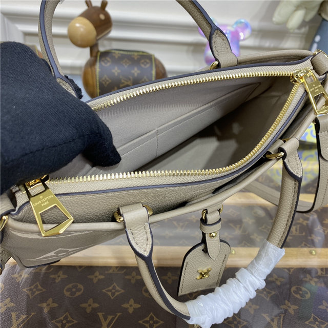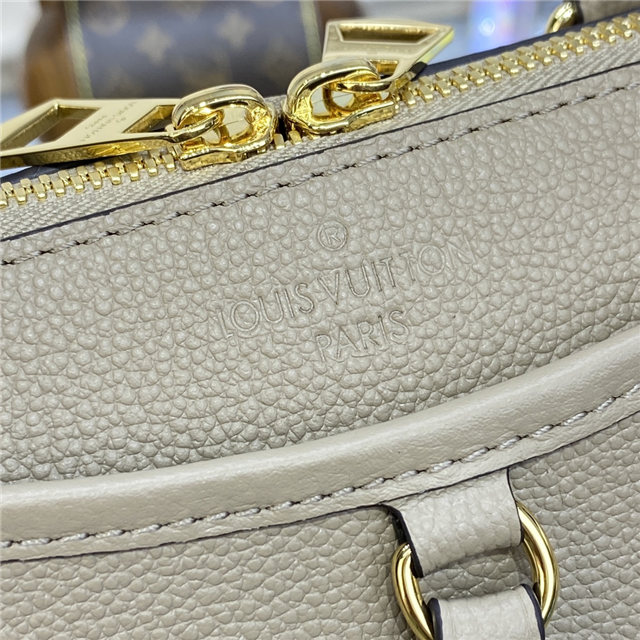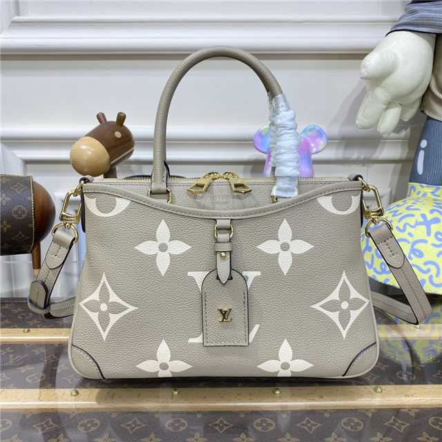 The Trianon PM tote, with its distinctive V-cut silhouette, is made from grained Monogram Empreinte leather with the Monogram Flowers and LVs embossed then printed on the leather in a soft cream tone. A long adjustable and removable strap, in addition to the two top handles, give carry options.