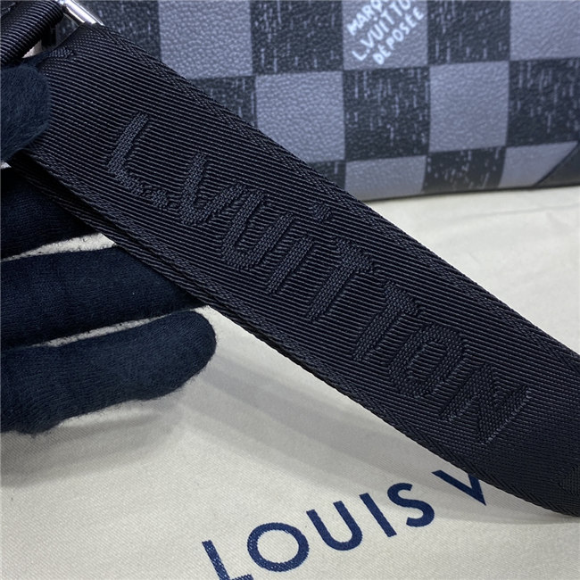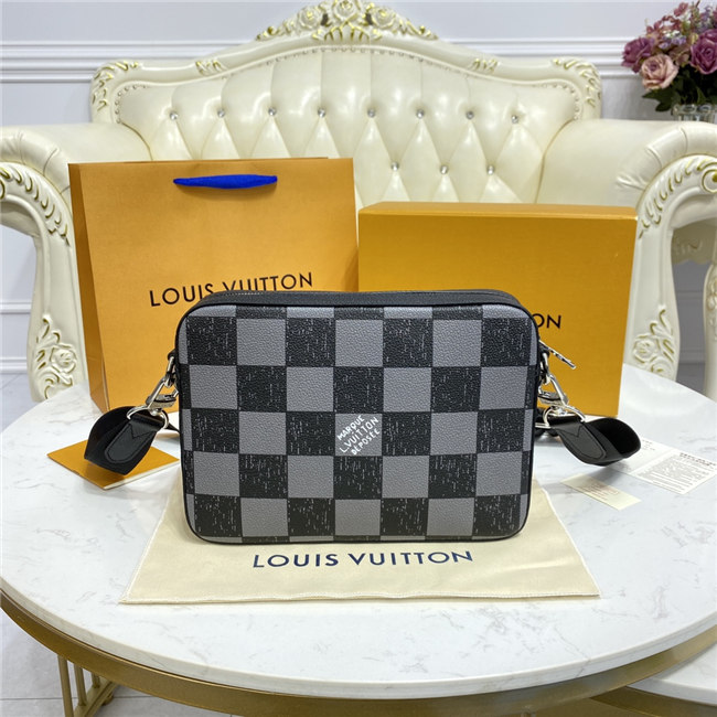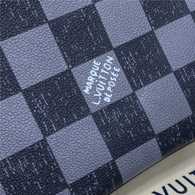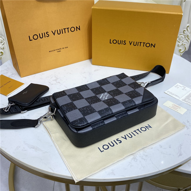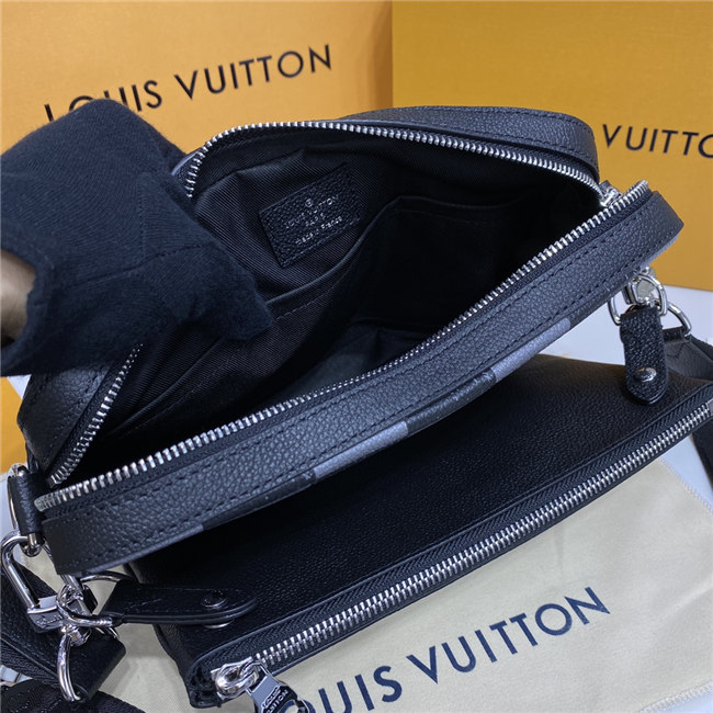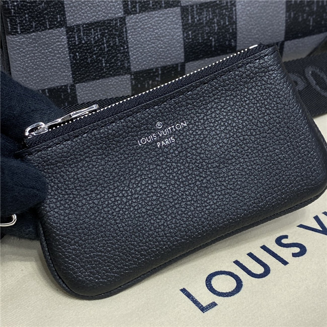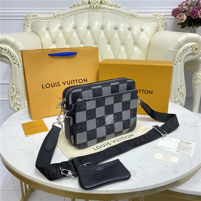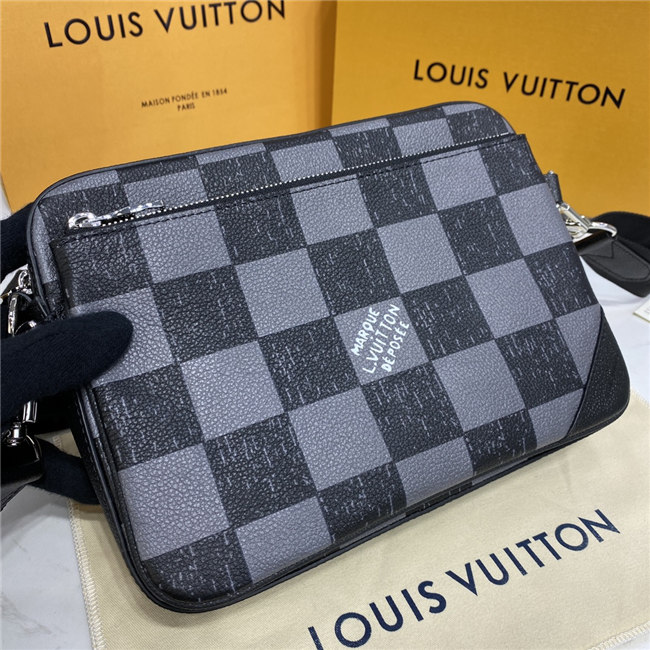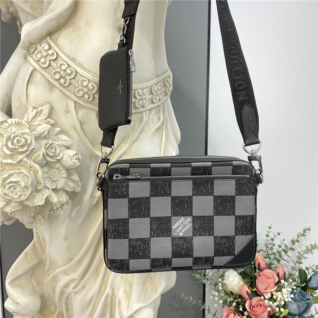 This Trio Messenger bag is made from cowhide leather with a black-and-gray Damier checkerboard pattern in which the black squares seemed to have been penciled in on the leather. The Trio combines a large main compartment, a removable zipped pocket, and a separate coin purse attached to the strap.