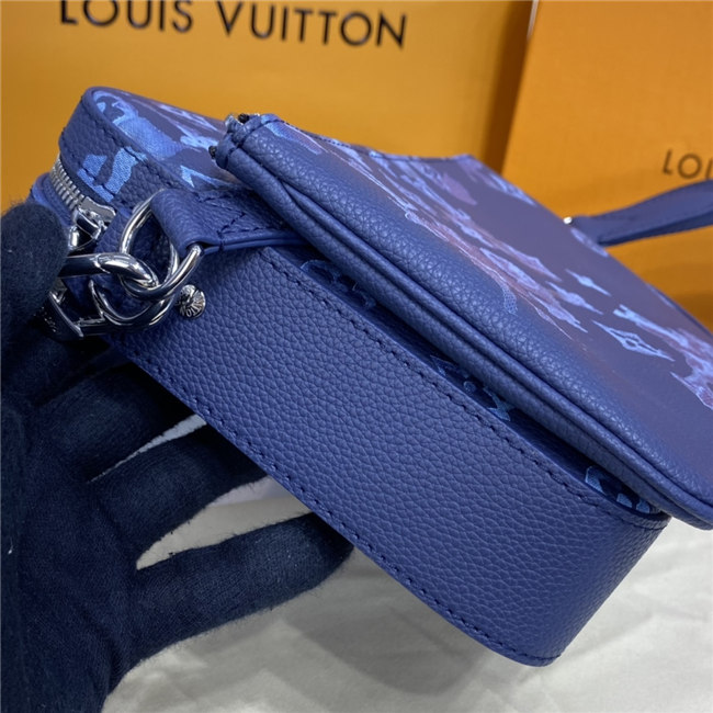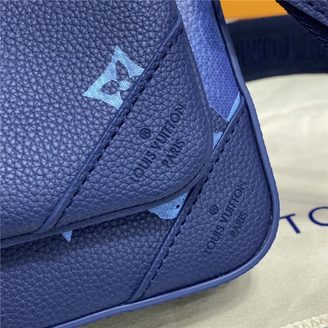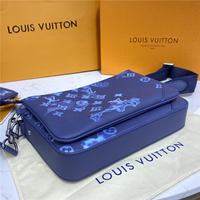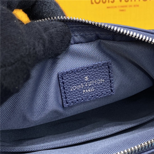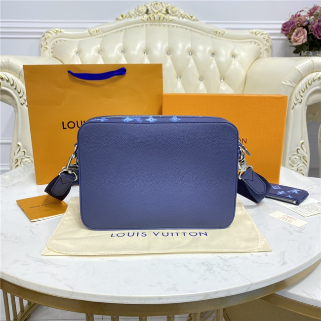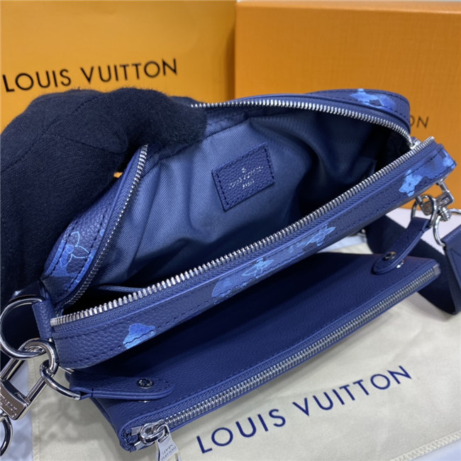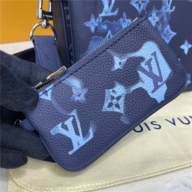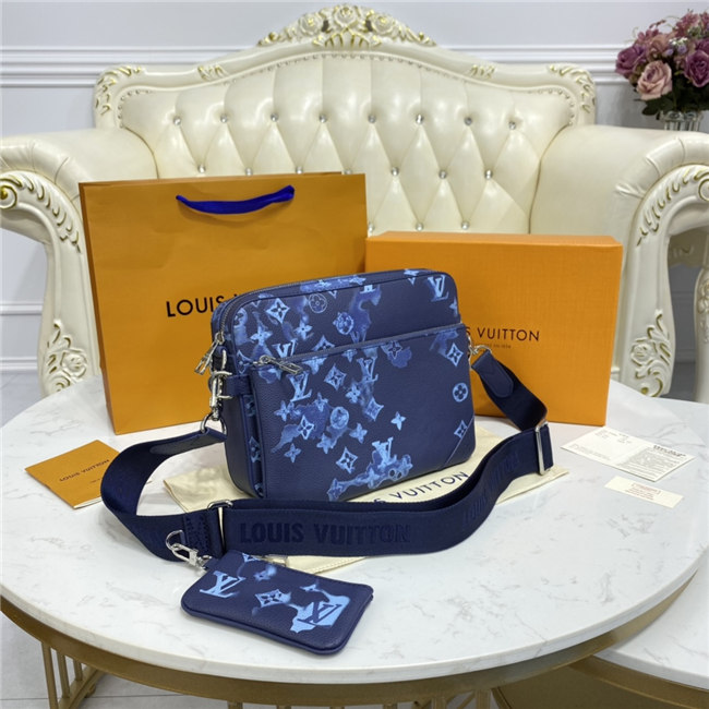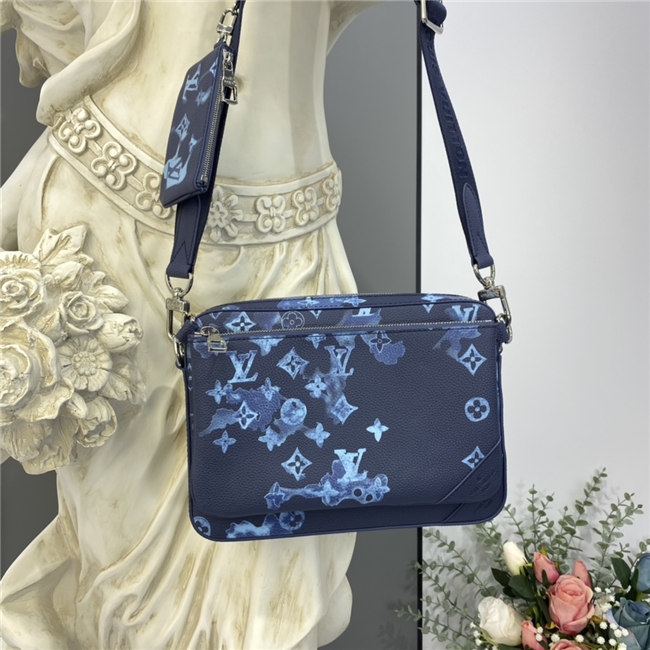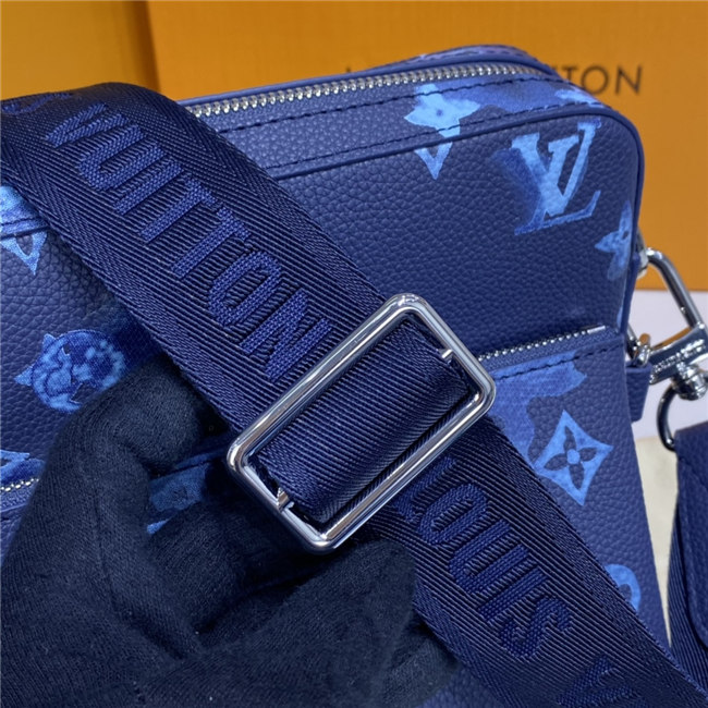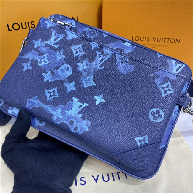 The light-blue-and-white Monogram motif printed irregularly on the grained leather of the Trio Messenger bag give a customized feel. This hybrid cross-body bag mixes functionality with fashion, thanks to a detachable zipped pocket on the front and a removable coin purse attached to the strap.