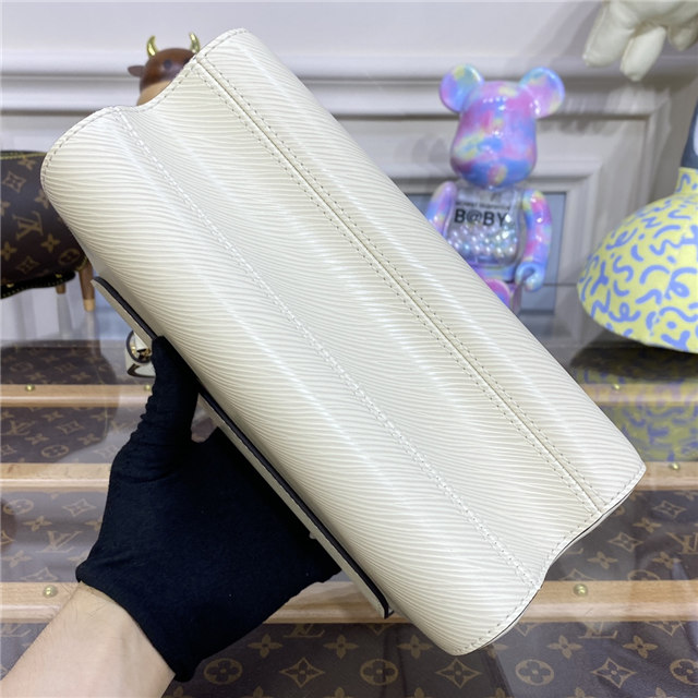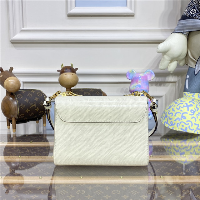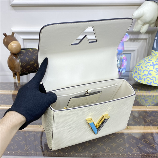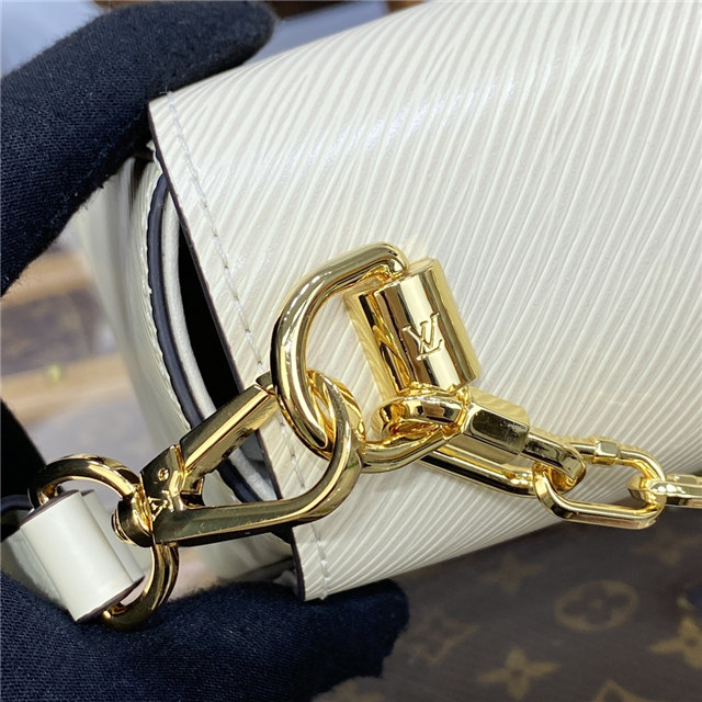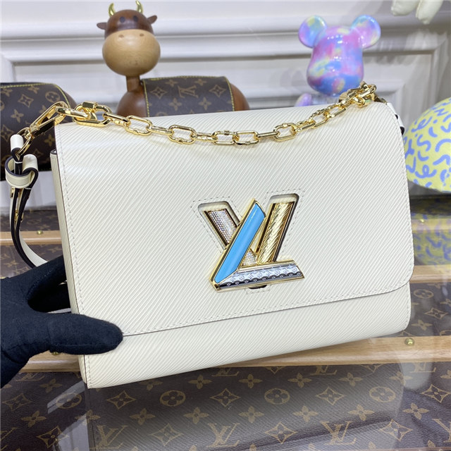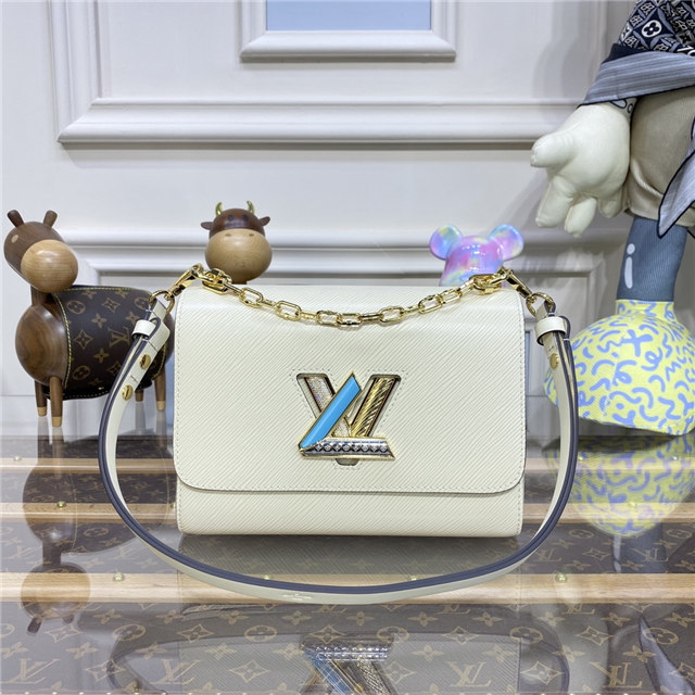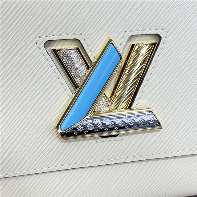 The LV Twist lock on this Twist MM handbag in Epi leather is reinterpreted in a four-part combination of colorful strass, enamel, Monogram engraving, and an engraving recalling the embossing on the Epi leather. A delicate faceted gold-color chain completes the revamp of this classic House bag.