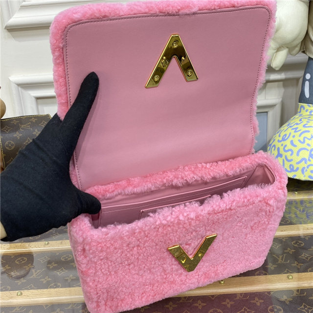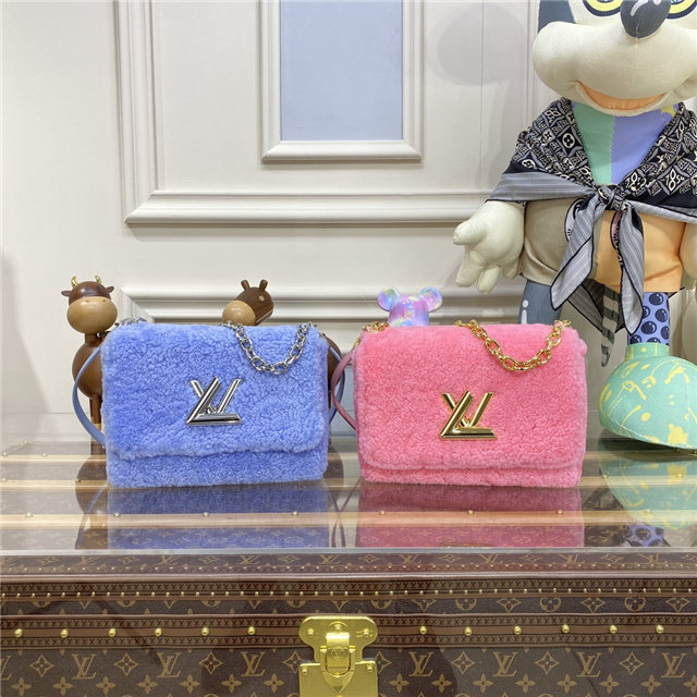 A fresh bright colorway brings an eye-catching aspect to this Twist MM hand bag in shearling. The bag is adorned with a removable silver-color double chain featuring an enamel Monogram Flower charm. The chain and leather strap are both removable to enable multiple attitudes and carry options.