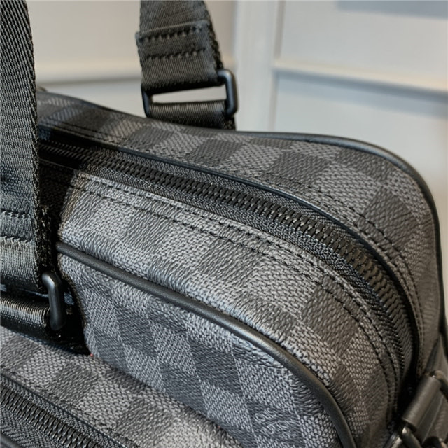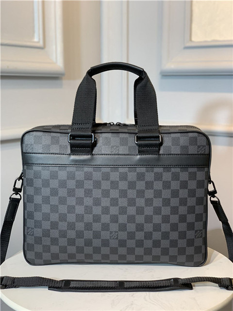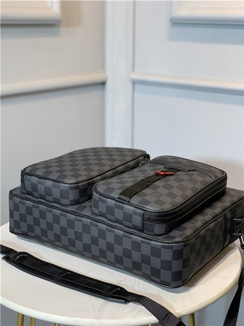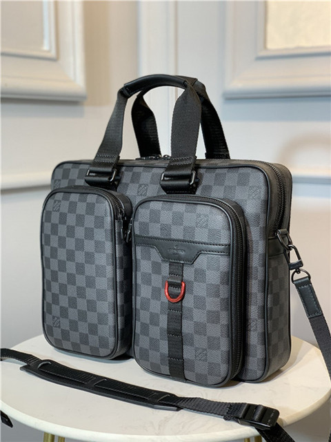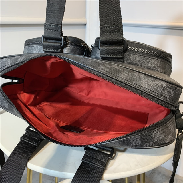 The ultra-functional Utility Business Bag comes in Damier Graphite canvas with black-and-red hardware and a red textile lining. The extra wide handles and adjustable strap with its leather shoulder pad enable comfortable carry options. The main zipped compartment and two side pockets can easily hold a laptop, iPad and assorted business documents.