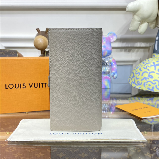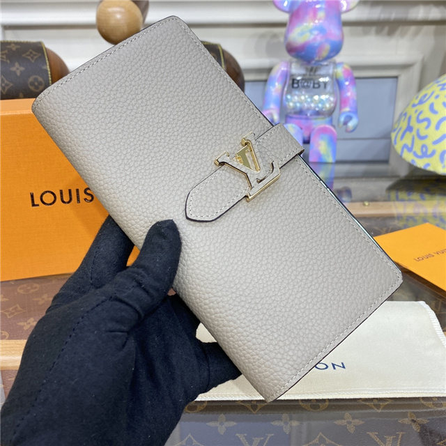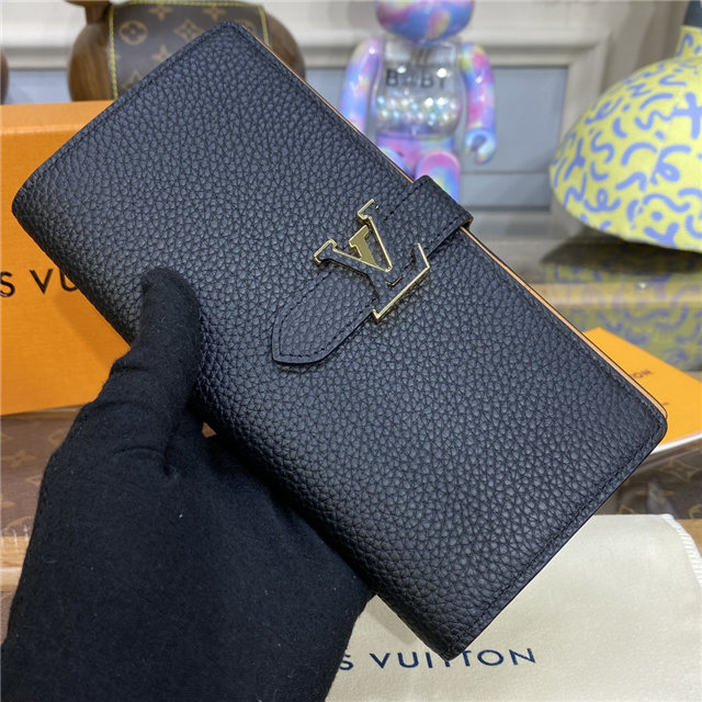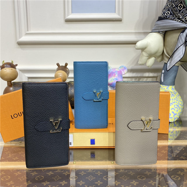 The LV Vertical wallet is an elegant design crafted from soft, grained Taurillon leather. It opens to reveal a contrasting lining, as well as eight card slots, a zipped coin pocket and a large, V-shaped slot for tickets and bills. This wallet features a distinctive sliding closure with an LV Initials accessory inspired by the iconic Capucines bag.