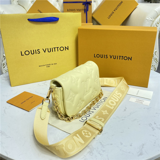 Part of the Bubblegram line, this Wallet on Strap is crafted from soft, padded calfskin, embroidered with the iconic Monogram pattern. This practical, on-trend wallet, which is secured by a magnetic flap, comes with a sporty nylon strap for shoulder or cross-body carry. When the strap is removed, it transforms into a chic, evening-ready clutch.