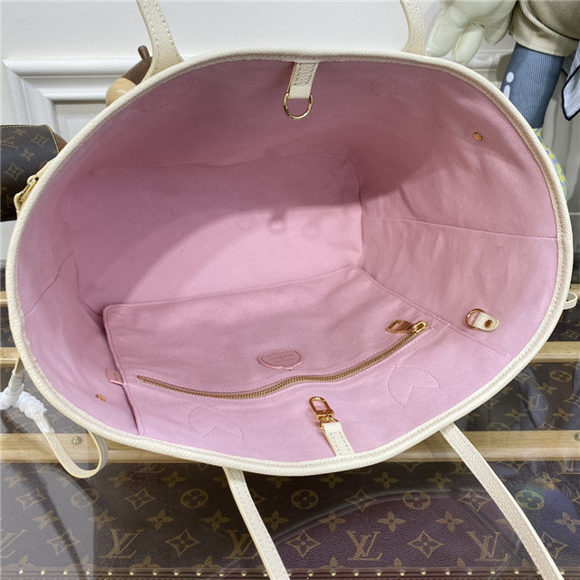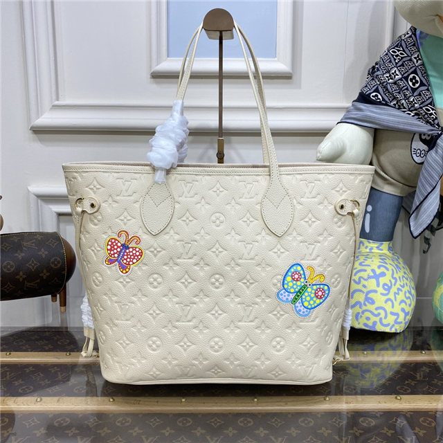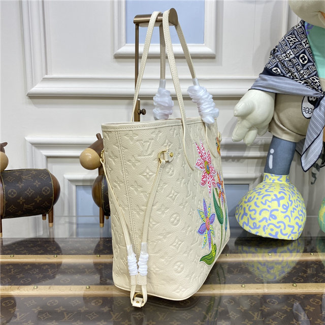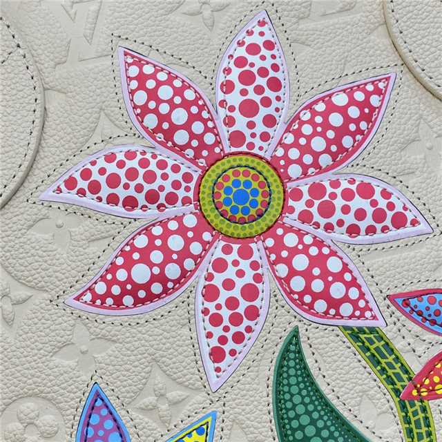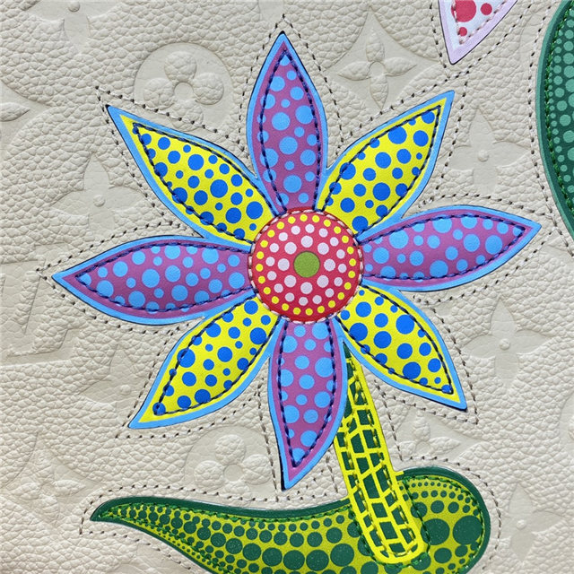The LVxYK Neverfull MM gets a feminine crafted touch with the “Flower” theme of the Louis Vuitton x Yayoi Kusama collection. Flowers were a major part of the artist’s childhood in Japan, where her parents ran a plant nursery, and later became a prominent theme in her work. For this user-friendly bag, three colorful blossoms are depicted in leather marquetry on quartz white Monogram Empreinte cowhide. An ode to art and craftsmanship.