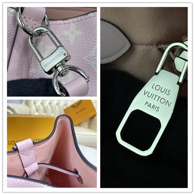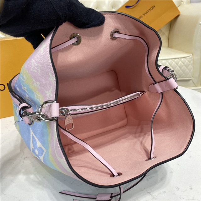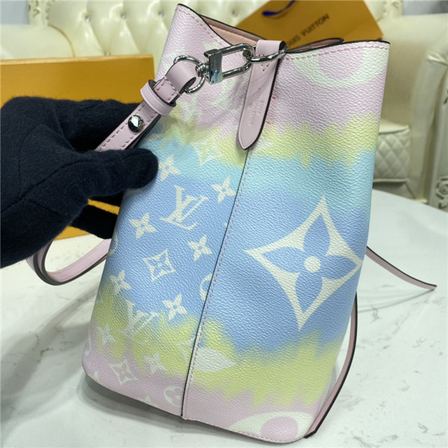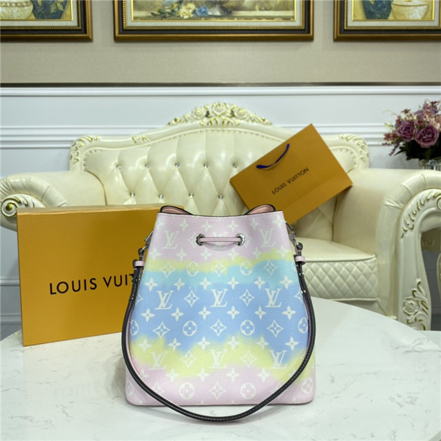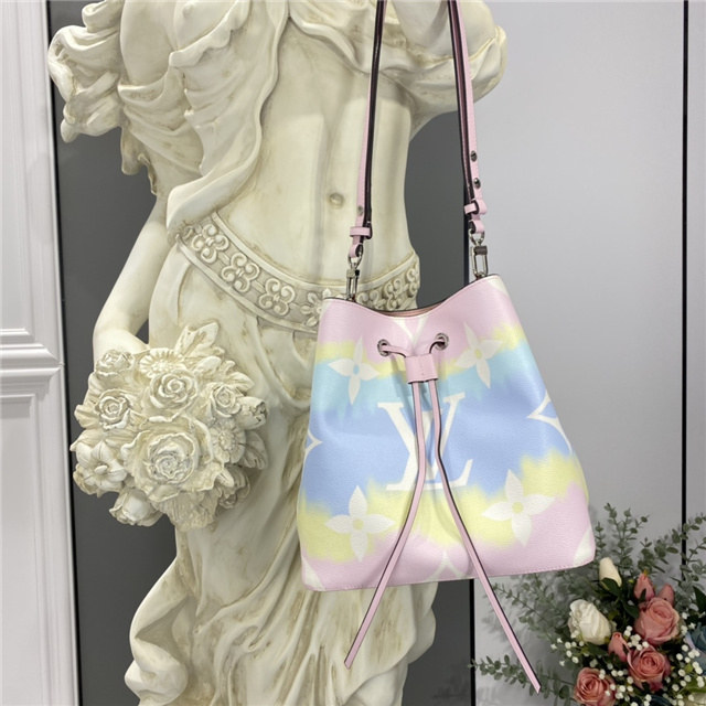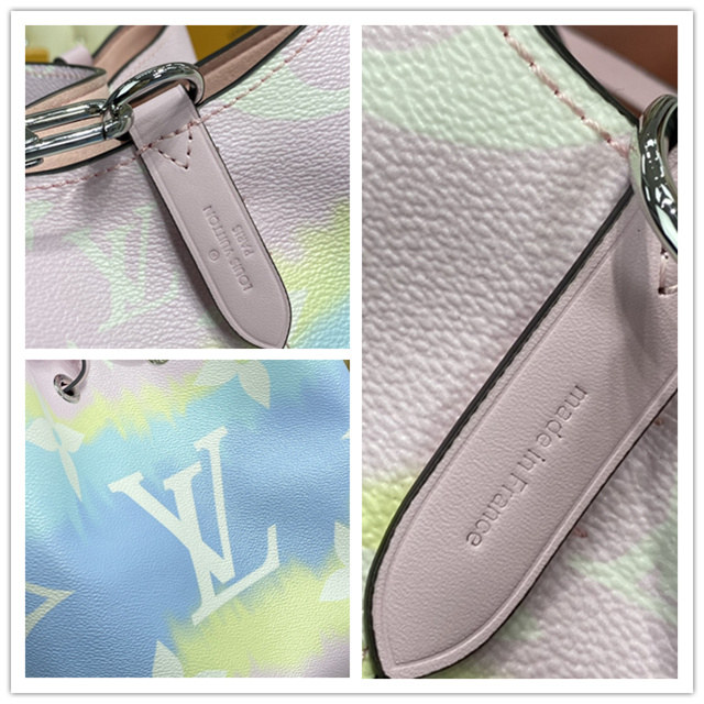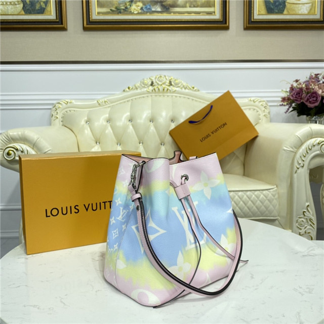 The NéoNoé bucket bag comes in Tie-Dye Monogram canvas for the LV Escale Collection. Present across Louis Vuitton handbags, shoes and ready-to-wear this season, this unexpected motif is inspired by the Japanese Shibori technique of knotting fabric before dyeing it. A lightweight bag, with a removable strap for a shoulder or cross-body carry.